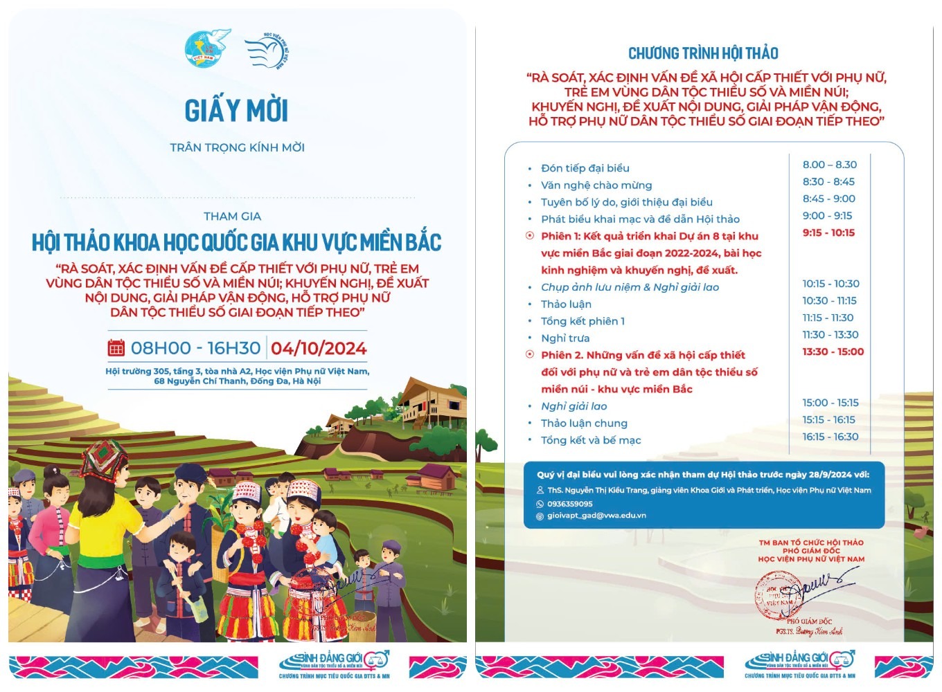 Hội thảo sẽ diễn ra vào ngày 4/10/2024, tại Học viện Phụ nữ Việt Nam với sự tham gia của các nhà khoa học, lãnh đạo, quản lý, đại diện các sở, ban, ngành, cùng các chuyên gia và đại biểu đến từ các cơ quan liên quan.