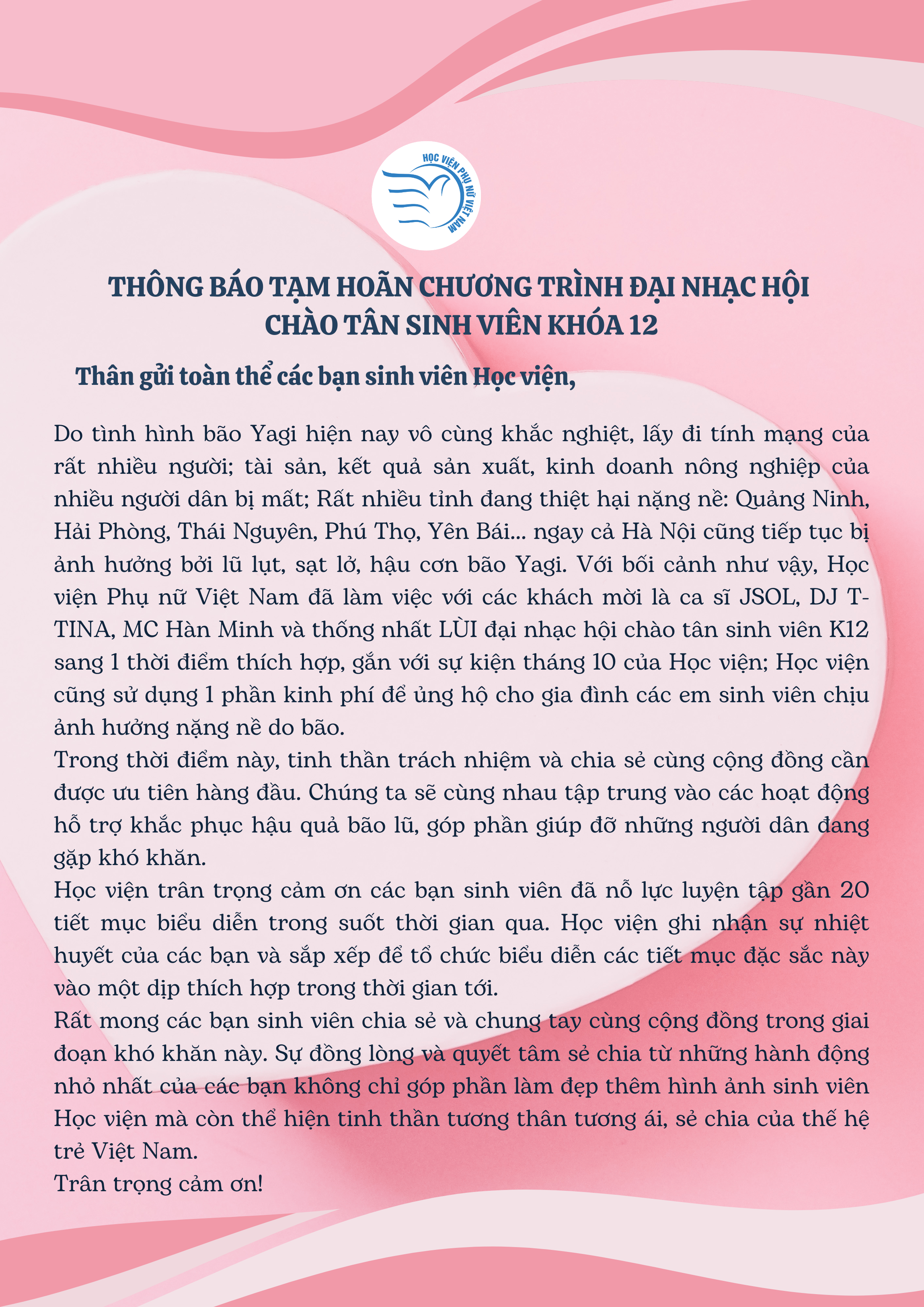 Học viện Phụ nữ Việt Nam lùi lịch tổ chức đại nhạc hội chào tân sinh viên K12 để cùng cộng đồng khắc phục hậu quả bão Yagi