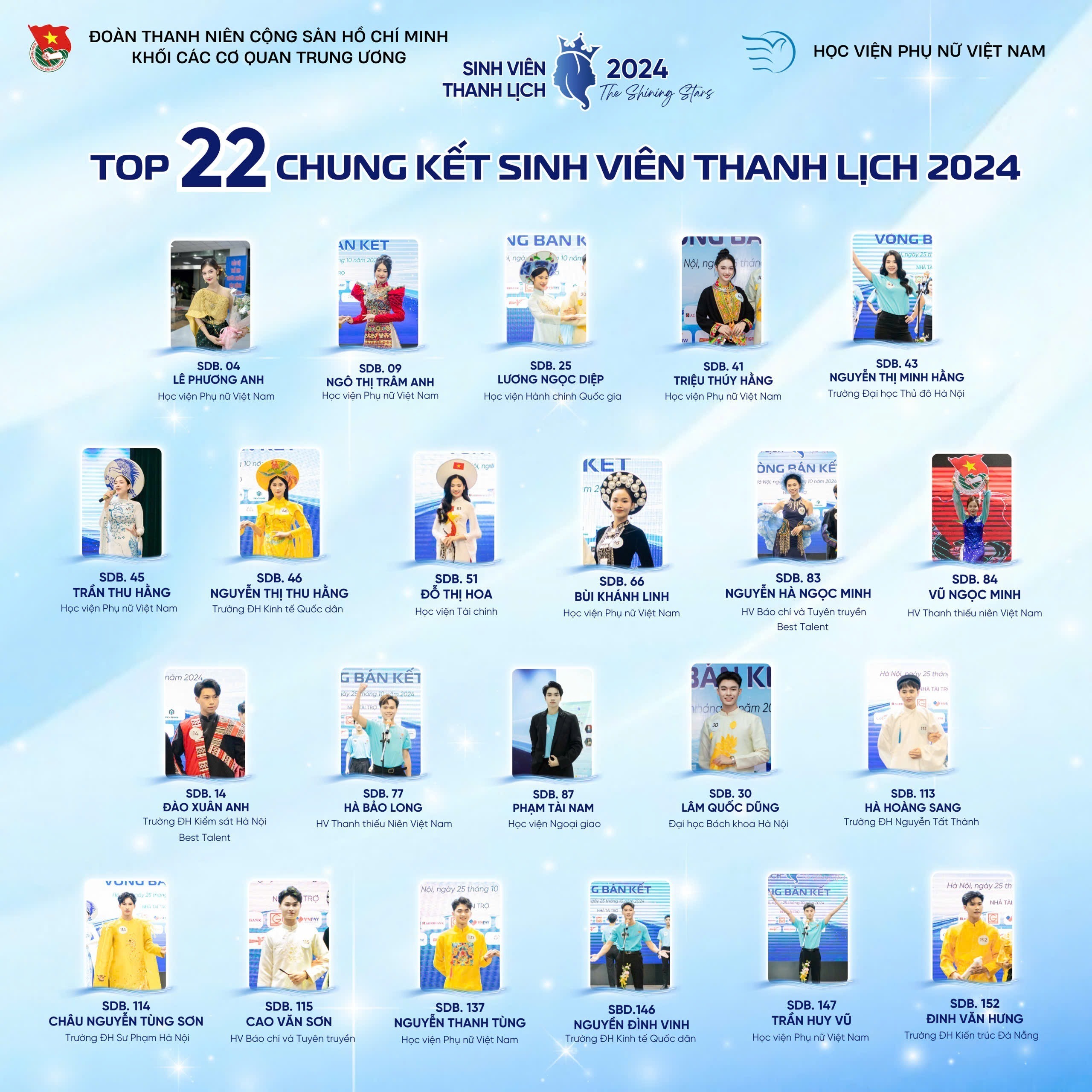 Cuộc thi Sinh viên thanh lịch 2024 là nơi vẻ đẹp, tri thức và tinh thần nhân ái của thế hệ sinh viên tỏa sáng. Các thí sinh sẽ tiếp tục rèn luyện và chuẩn bị để mang đến những màn trình diễn ấn tượng hơn trong đêm chung kết. Cùng chờ đón vòng chung kết dự kiến diễn ra vào ngày 20/11 tại Học viện Phụ nữ Việt Nam, nơi những tài năng mới sẽ ghi dấu ấn sâu đậm trong lòng khán giả và tiếp nối hành trình phát triển bản thân.