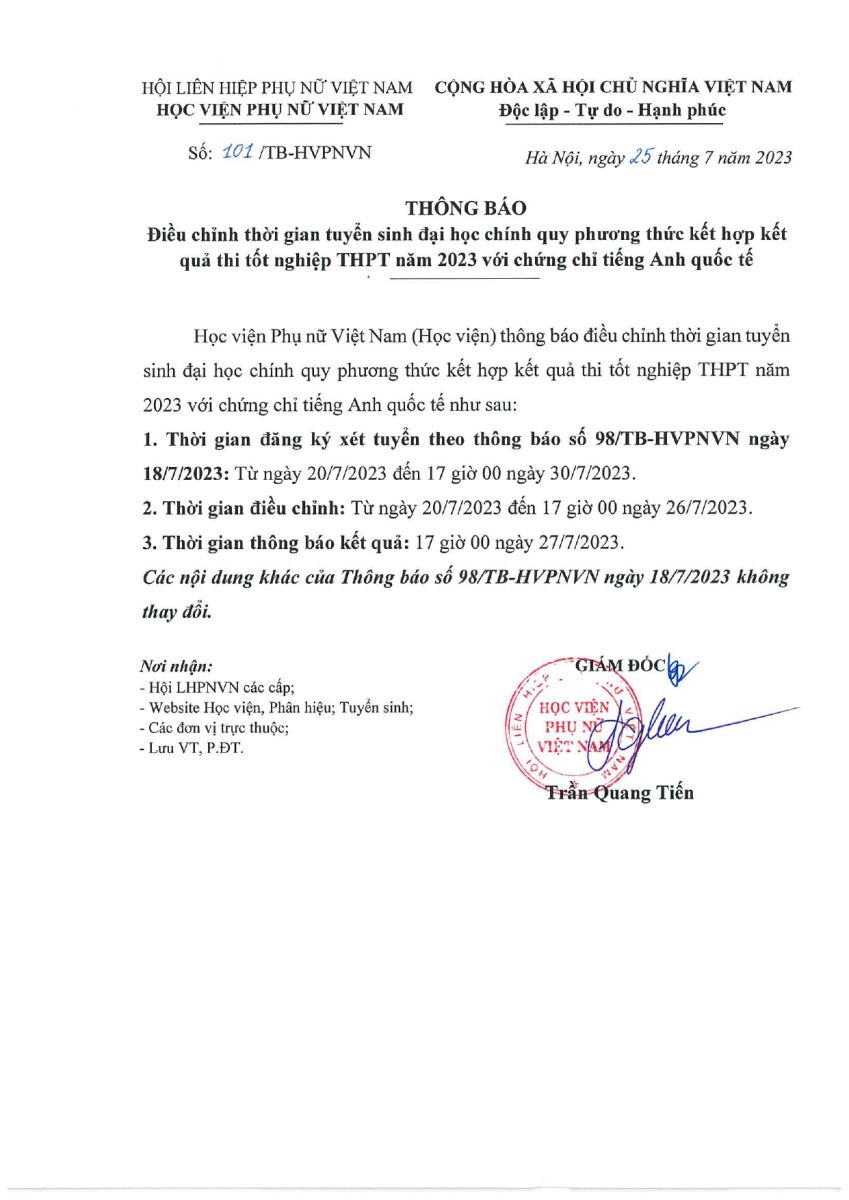 Tin tức26/7, hết hạn đăng ký xét tuyển phương thức kết hợp điểm thi và chứng chỉ TA quốc tế Posted on Tháng Ba 4, 2024 by admin(full) 04 Th3 Xem thông báo số 98 TẠI ĐÂY admin(full) VWA – Chung một mái nhà THÔNG BÁO ĐIỂM TRÚNG TUYỂN THEO PHƯƠNG THỨC XÉT ĐIỂM THI TỐT NGHIỆP THPT NĂM 2023