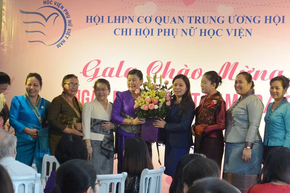 Các chị học viên Lào chúc mừng chị em học viện ngày 20/10