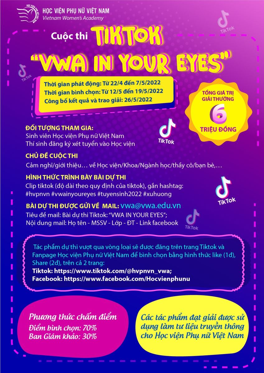 Cuộc thi VWA IN YOUR EYES chính là sân chơi danh cho giới trẻ yêu thích sử dụng Tiktok để thể hiện ý tưởng sáng tạo, độc đáo và mang đậm dấu ấn cá nhân của sinh viên VWA và các bạn trẻ đăng ký xét tuyển tại Học viện. Ban tổ chức hi vọng sẽ nhận được nhiều tác phẩm dự thi chất lượng, đặc sắc của các bạn để lan tỏa hình ảnh của những VWAer thông minh, sáng tạo. Mỗi tác phẩm dự thi của các bạn sẽ là một kỉ niệm đẹp trong quãng đời thanh xuân dưới mãi trường Học viện Phụ nữ Việt Nam.