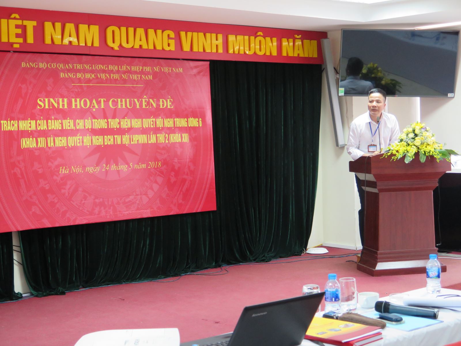 TS. Trần Quang Tiến, Bí thư Đảng ủy Học viện chủ trì hội nghị đã phát biểu đề dẫn nêu rõ mục đích, ý nghĩa của hội nghị, mong muốn và hy vọng thông qua các tham luận sẽ giúp đảng viên, quần chúng hiểu sâu sắc hơn về 04 Nghị quyết Hội nghị Ban Chấp hành TW Đảng lần thứ 6 và 01 Nghị quyết Ban Chấp hành Hội Liên hiệp Phụ nữ Việt Nam, đặc biệt là Nghị quyết số 19 -NQ/TW về tiếp tục đổi mới hệ thống tổ chức và quản lý, nâng cao chất lượng và hiệu quả hoạt động của các đơn vị sự nghiệp công lập có liên quan trực tiếp đến Học viện.