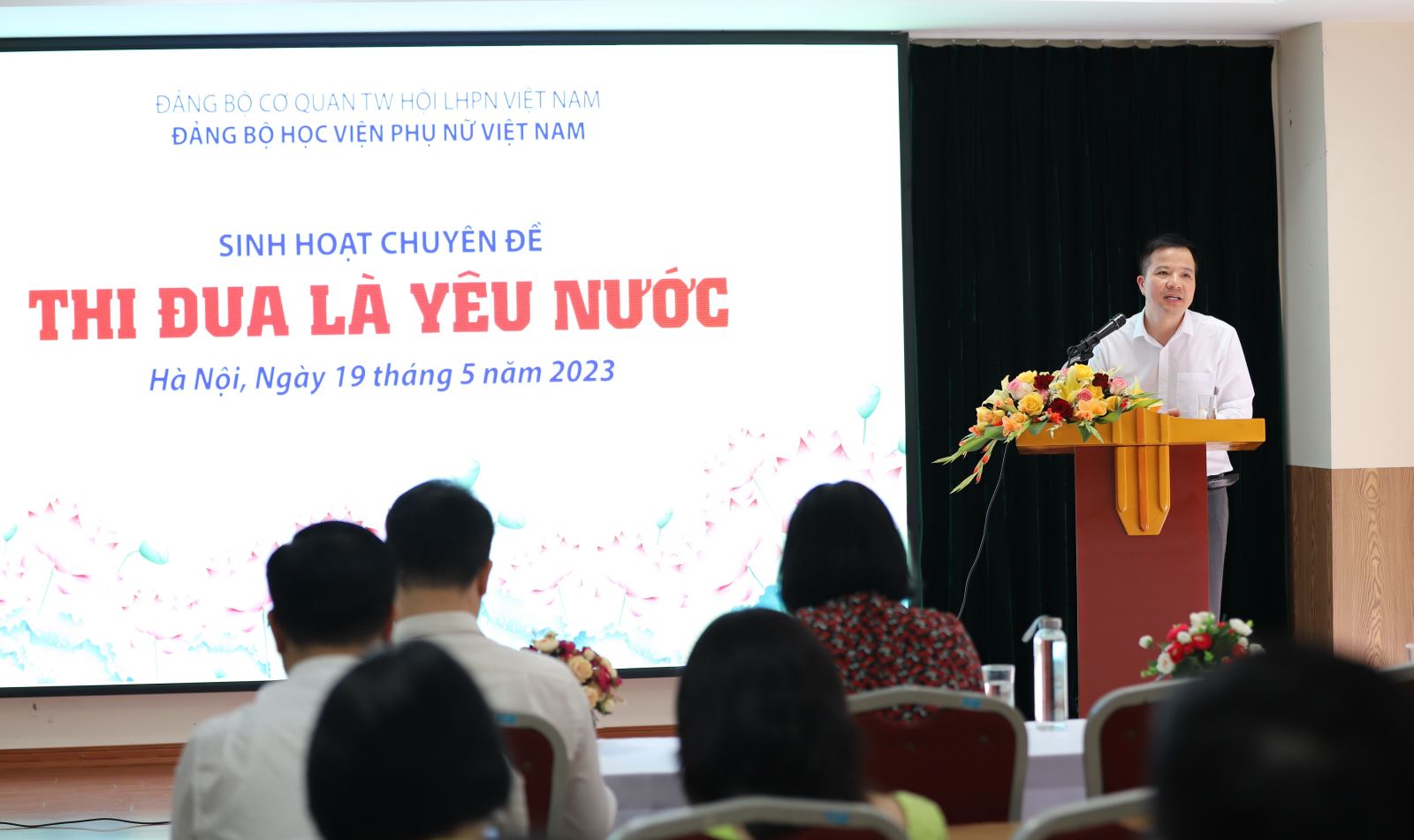 Tham dự buổi sinh hoạt có đồng chí Ngô Thị Ngọc – Phó Bí thư Đảng ủy cơ quan TW Hội Liên hiệp Phụ nữ Việt Nam; Đồng chí Trần Quang Tiến – Ủy viên BCH Đảng bộ Cơ quan TƯ Hội LHPN Việt Nam, Bí thư Đảng ủy Học viện Phụ nữ Việt Nam cùng toàn thể đảng viên và các quần chúng ưu tú của Học viện Phụ nữ Việt Nam.