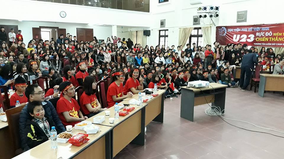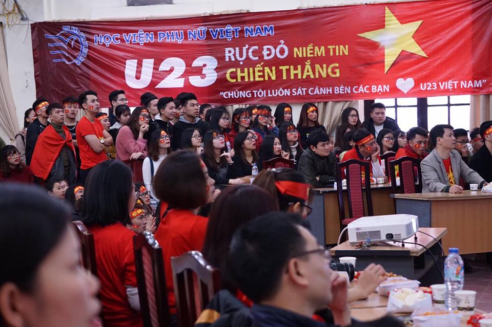 Trận đấu mang tính lịch sử khi lần đầu tiên một đội tuyển bóng đá Việt Nam được lọt vào chung kết của một giải đấu cấp châu lục. Tại hội trường I, những tiếng reo hò, những tiếng cười hạnh phúc và cả giọt nước mắt tiếc nuối giữa một rừng băng rôn, cờ đỏ suốt toàn bộ thời gian của trận đấu. Rất nhiều cung bậc cảm xúc đã được thể hiện nơi đây. Thầy Trần Quang Tiến – Giám đốc Học viện Phụ nữ Việt Nam chia sẻ: “Tôi thực sự hạnh phúc khi được có mặt ở đây, vào thời khắc mang đầy dấu ấn lịch sử đối với đội U23 và thể thao Việt Nam. Được hòa chung tiếng reo hò, cổ vũ đầy nhiệt huyết của thầy cô và các em sinh viên, tôi thấy dường như cả nước đang xích lại gần nhau vì một cái tên thân thương U23 Việt Nam. Cho dù kết quả như thế nào tôi cũng cảm thấy thật hạnh phúc, xúc động. Tại nơi này – Học viện Phụ nữ Việt Nam không chỉ có tình thầy trò, tình bạn bè mà hiện diện cả tinh thần dân tộc”. Cùng cảm xúc với Thầy Tiến, sinh viên Trần Thùy An K3 Luật B chia sẻ “Trong quãng thời gian sinh viên của mình, đây có lẽ là kỷ niệm đầu tiên và đáng nhớ nhất đối với em về thể thao Việt Nam. Khi được cùng thầy cô, các bạn cổ vũ U23 Việt Nam tại Học viện, em cảm thấy rất vui, tự hào và nhiệt huyết tuổi trẻ trong em như được bùng cháy”. Sinh viên Chu Văn Tính K3 Luật A khẳng định “Những chương trình ngoại khóa như thế sẽ giúp chúng em giảm bớt đi những áp lưc học tập sau những giờ không lao vào những tệ nạn phát sinh ngoài xã hội”. Sinh viên Đặng Hữu Hoàng K4 QTKD A xúc động nói “Có lẽ, chỉ có những dịp như thế này thì khoảng cách giữa chúng ta mới gần nhau đến vậy. Cùng thầy cô và các bạn cùng hô vang “Việt Nam chiến thắng”, em có cảm thực sự tự hào, cảm giác như cả dân tộc cùng chung một tiếng nói, triệu triệu con tim cùng chung một nhịp đập vậy”.