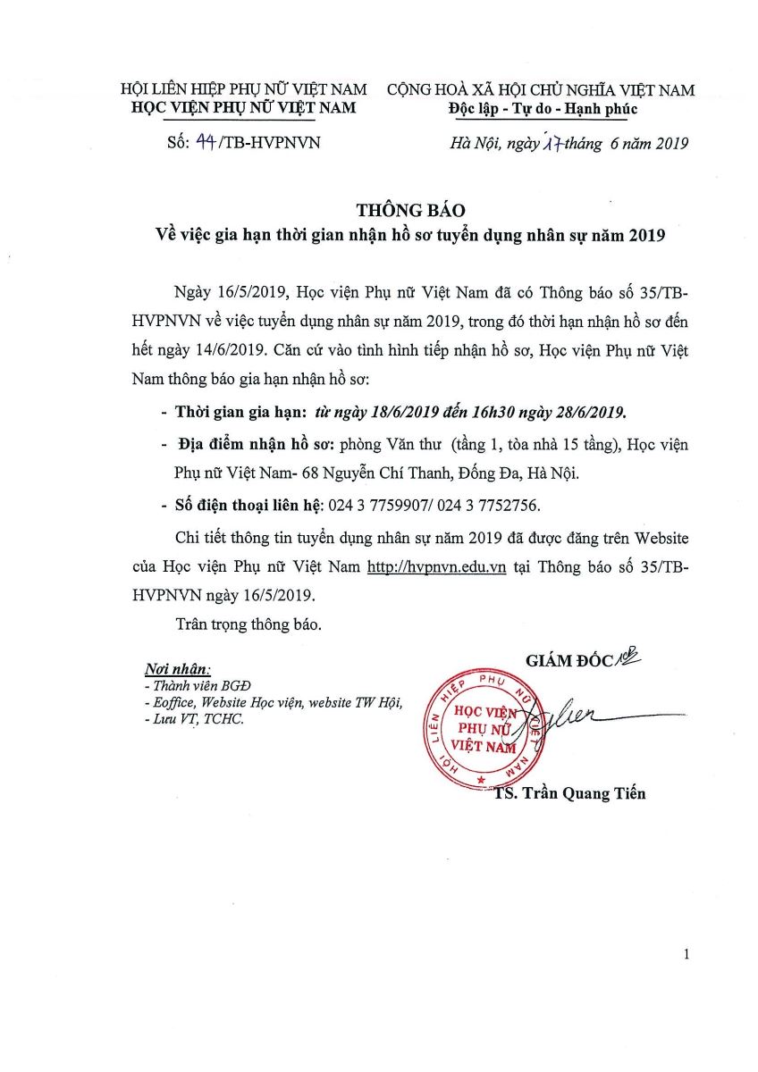Tin tứcGia hạn thời gian nhận hồ sơ tuyển dụng năm 2019 Posted on Tháng Ba 4, 2024 by admin(full) 04 Th3 Thông tin tuyển dụng chi tiết xem TẠI ĐÂY admin(full) Thông báo thay đổi thời hạn xét tuyển học bạ năm 2019Học viện Phụ nữ Việt Nam đón tân sinh viên khóa 7 nhập học
