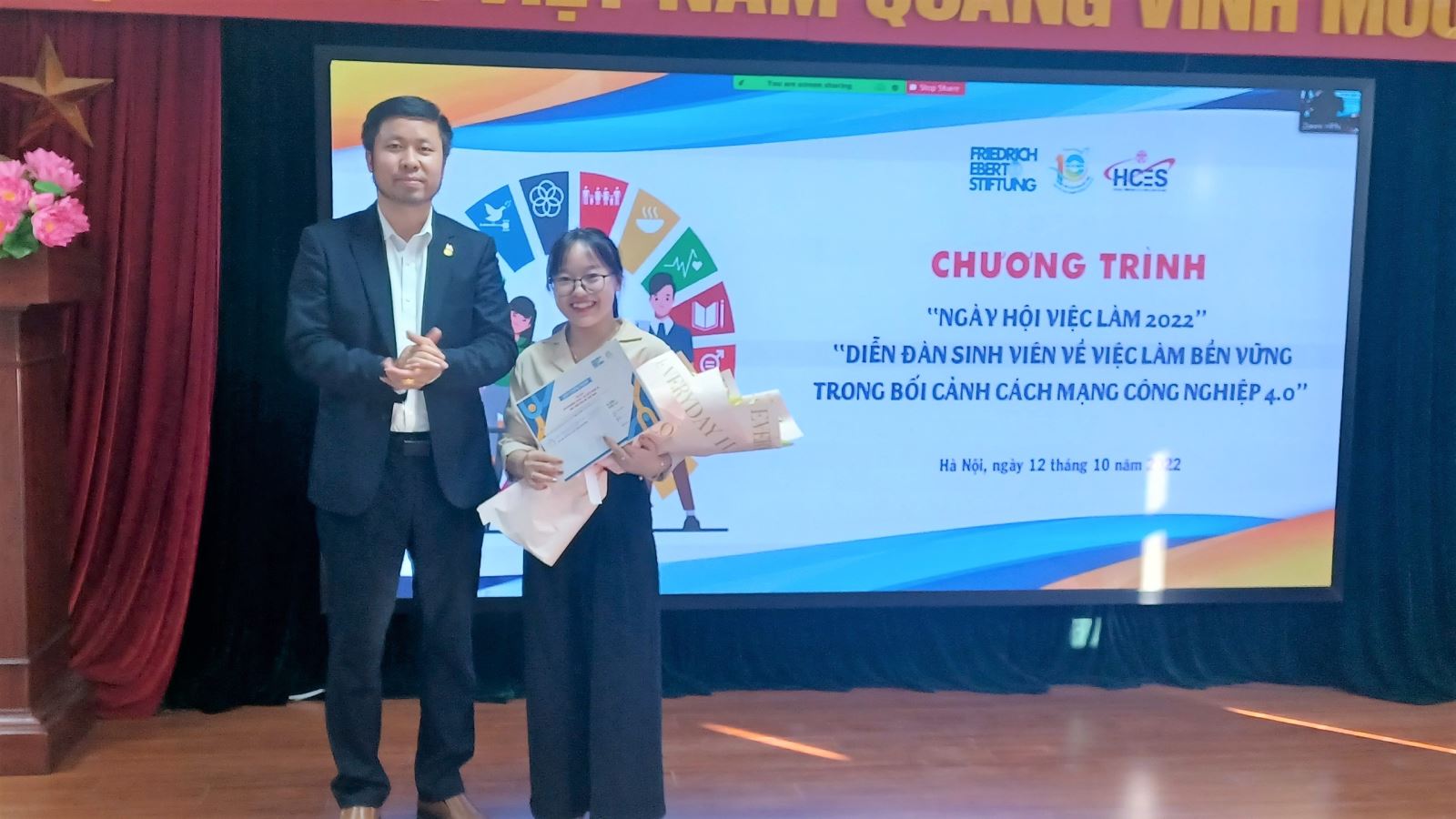 Giải nhất thuộc về nhóm sinh viên: Vương Tiểu Vi và Nguyễn Việt Hoàng đến từ Đại học Kiểm sát Hà Nội với chủ đề: Nâng cao sức cạnh tranh cho sinh viên Việt Nam trên thị trường lao động nhằm đảm bảo mục tiêu phát triển bền vững.