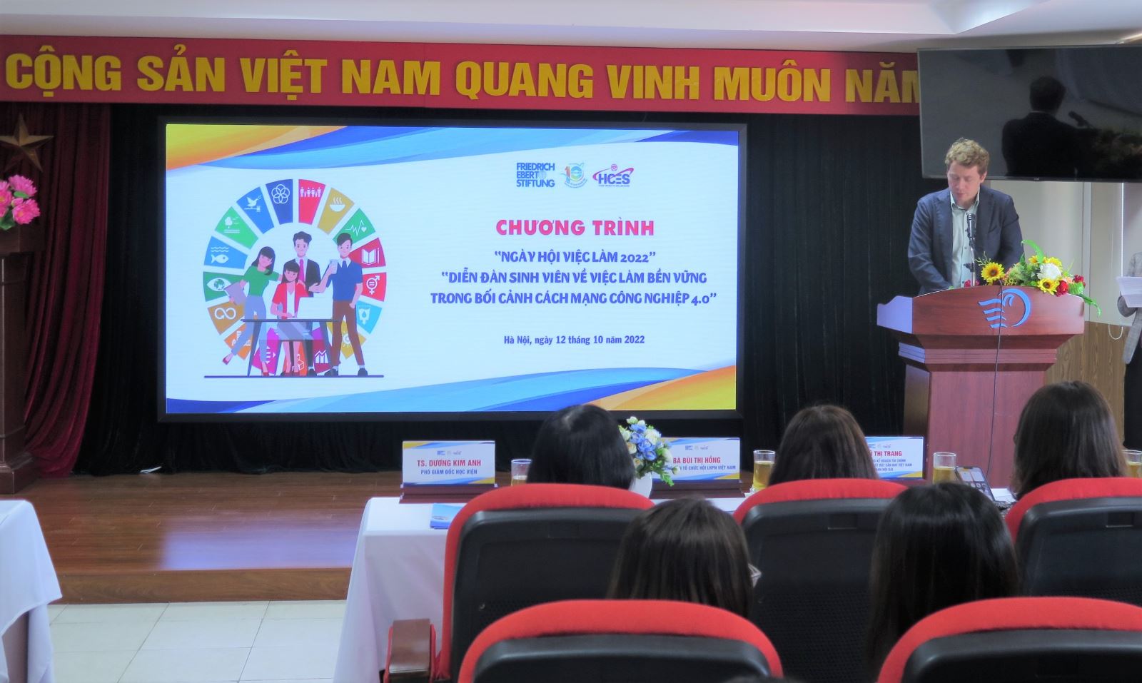 Ngày 12/10/2022, Học viện Phụ nữ Việt Nam phối hợp với Viện Friedrich-Ebert-Stiftung (FES), Trung tâm Dịch vụ việc làm Hà Nội – Sở LĐTB&XH Hà Nội tổ chức Ngày hội việc làm 2022 và Vòng 3 Diễn đàn: Sinh viên với việc làm bền vững trong bối cảnh công nghiệp 4.0.