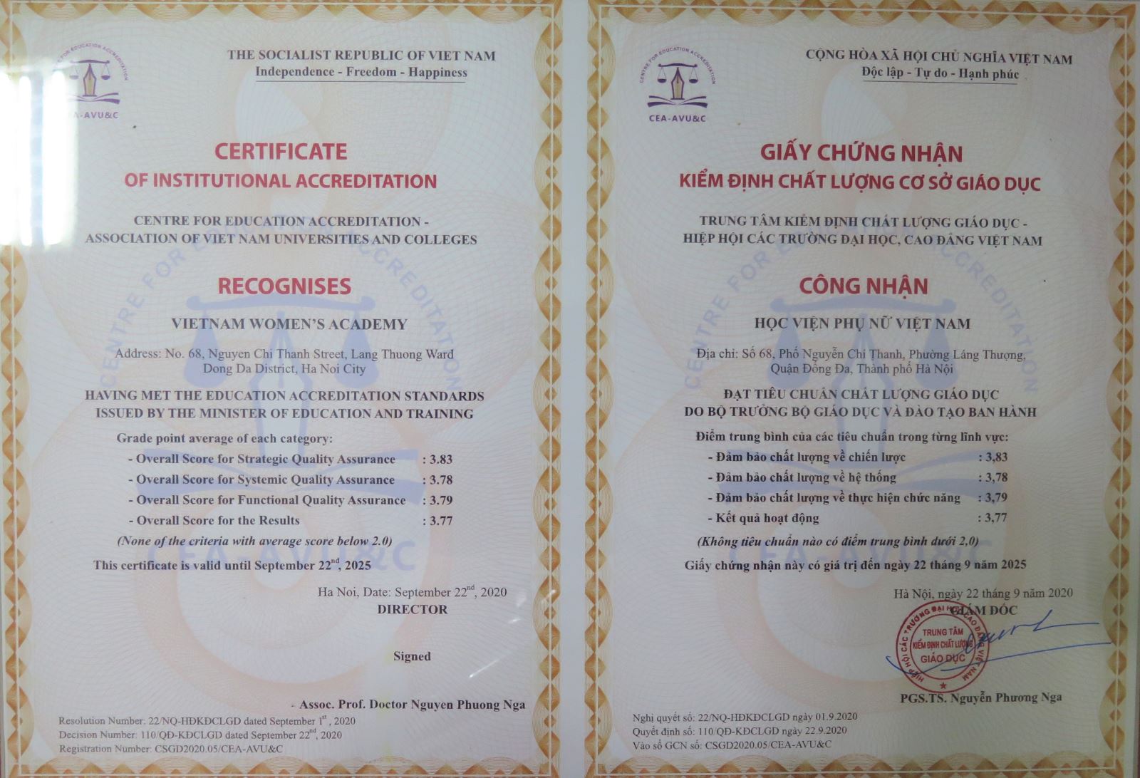 Buổi Lễ “Công bố Quyết định và trao Giấy chứng nhận kiểm định chất lượng giáo dục cho Học viện Phụ nữ Việt Nam” diễn ra vào ngày 29/9/2020 vinh dự tiếp đón các đồng chí lãnh đạo TW Hội LHPN Việt Nam; lãnh đạo Bộ Giáo dục và Đào tạo, các chuyên gia đánh giá ngoài đến từ Trung tâm Kiểm định chất lượng giáo dục – Hiệp hội các trường Đại học Cao đẳng Việt Nam (CEA-AVU&C)…