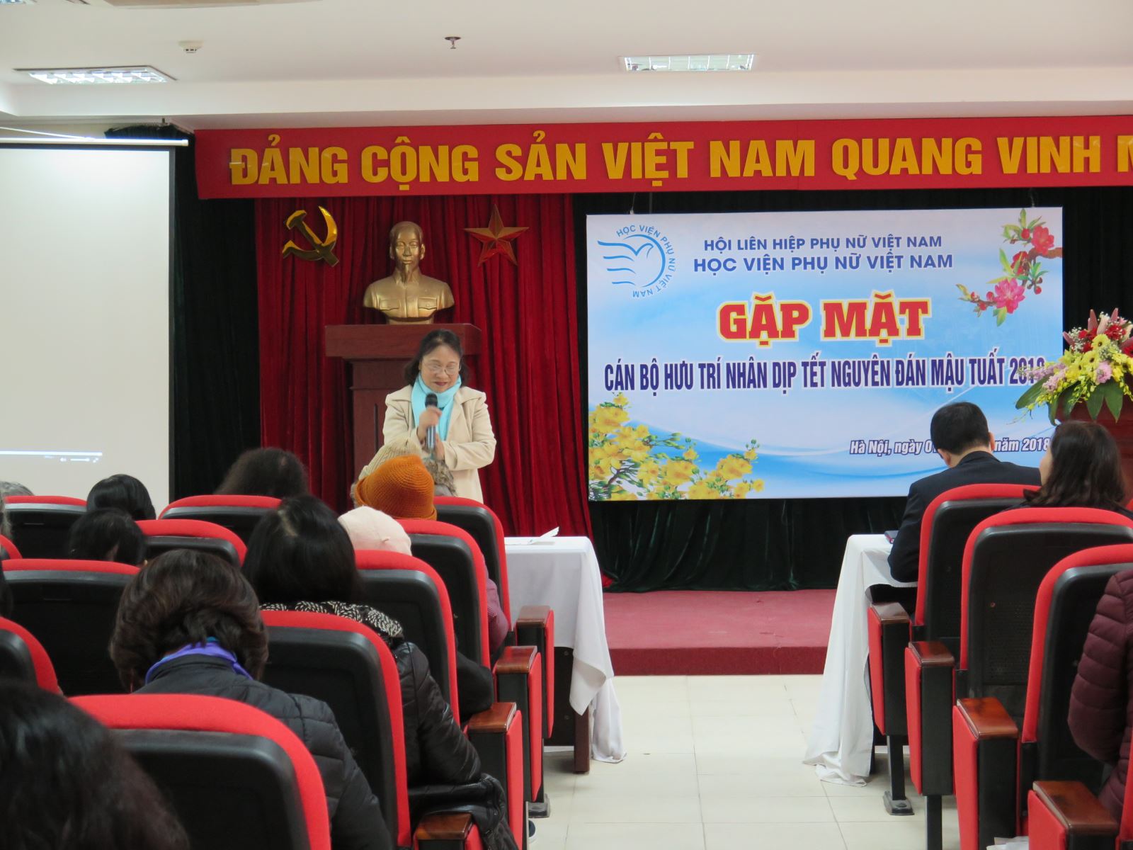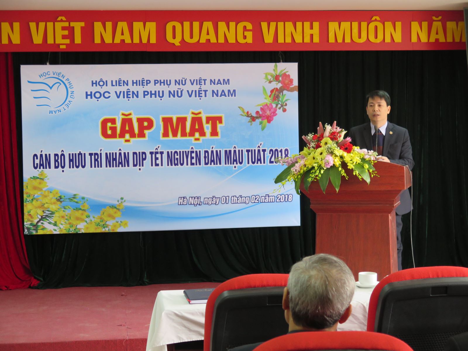 TS. Trần Quang Tiến bày tỏ niềm vui mừng được đón các đồng chí nguyên là lãnh đạo Trường Cán bộ Phụ nữ TW, giảng viên, nghiên cứu viên, viên chức và người lao động đã nghỉ hưu về dự buổi gặp mặt cuối năm không chỉ là truyền thống mà còn là sự động viên, khích lệ to lớn đối với thế hệ lãnh đạo và viên chức Học viện hôm nay. Đồng thời, báo cáo nhanh tình hình hoạt động của Học viện Phụ nữ Việt Nam trong năm 2017 và nhiệm vụ trọng tâm trong năm 2018: