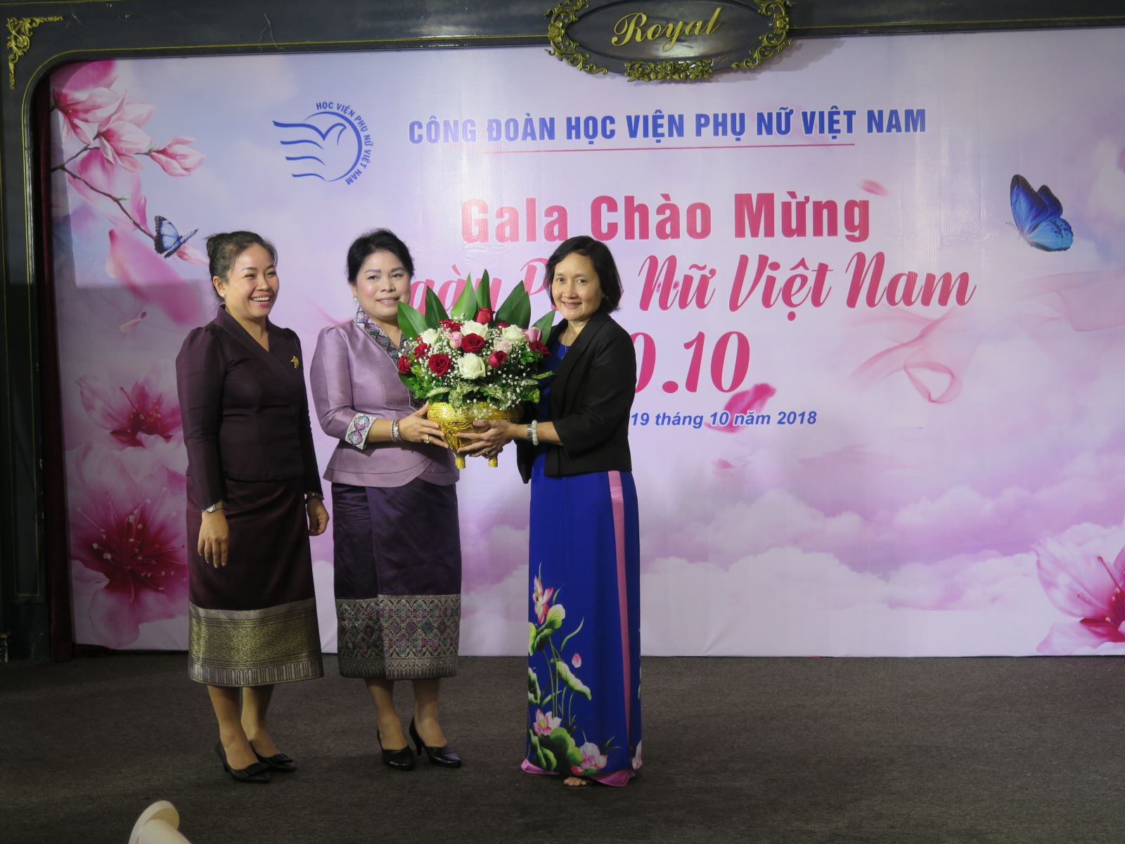 Thay mặt nữ chị em phụ nữ Học viện, đồng chí Hà Thị Thanh Vân nhận hoa chúc mừng từ đại diện đoàn học viên lớp bồi dưỡng cán bộ Lào