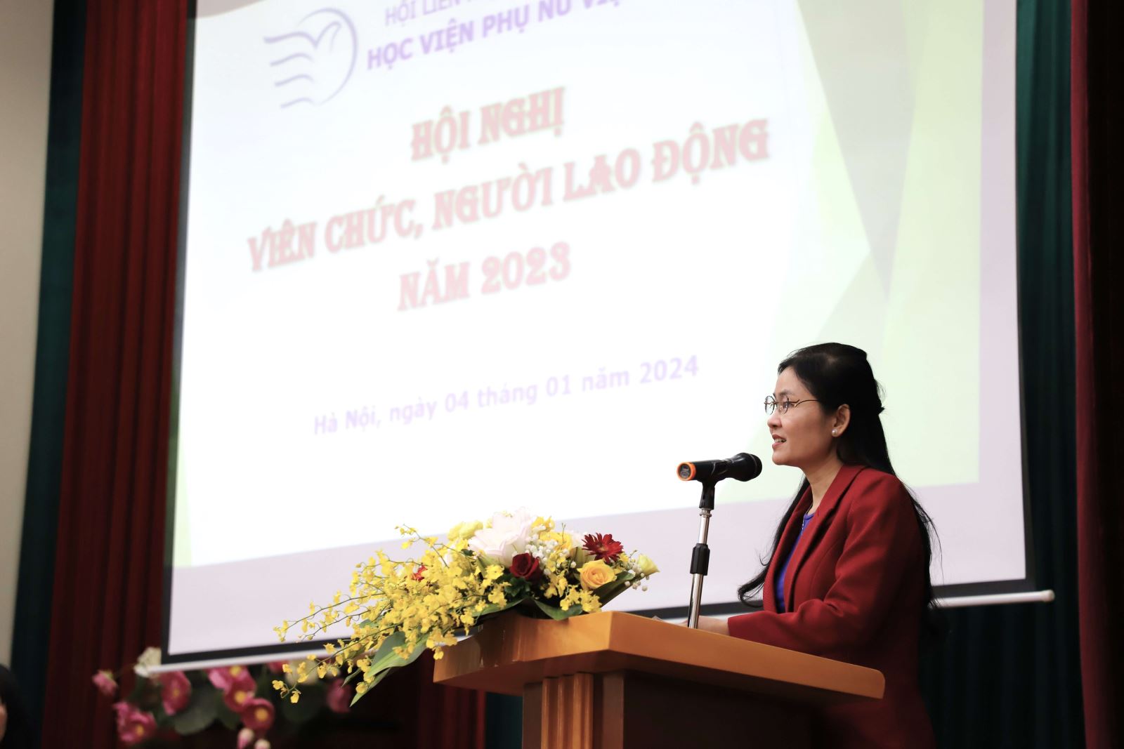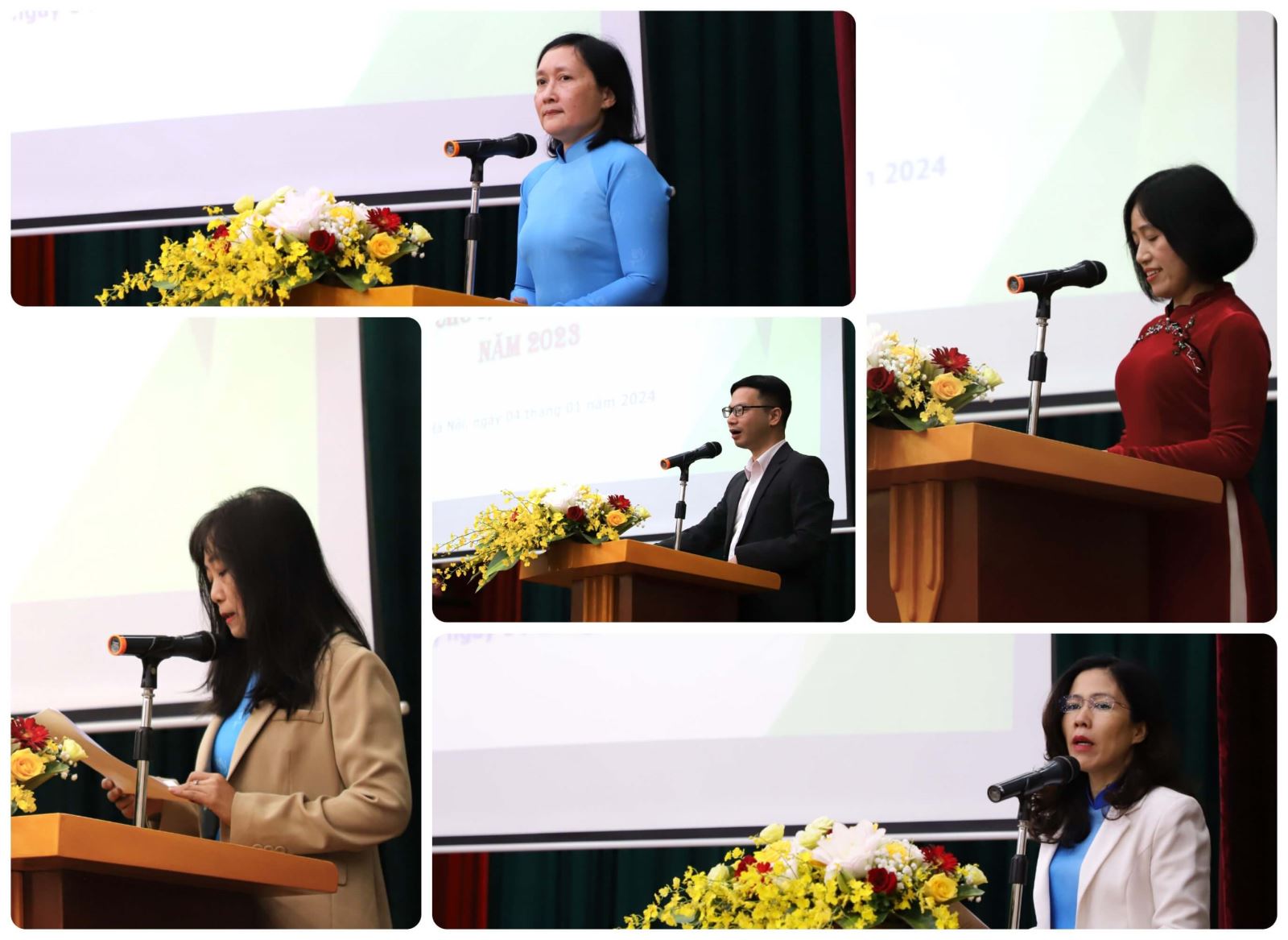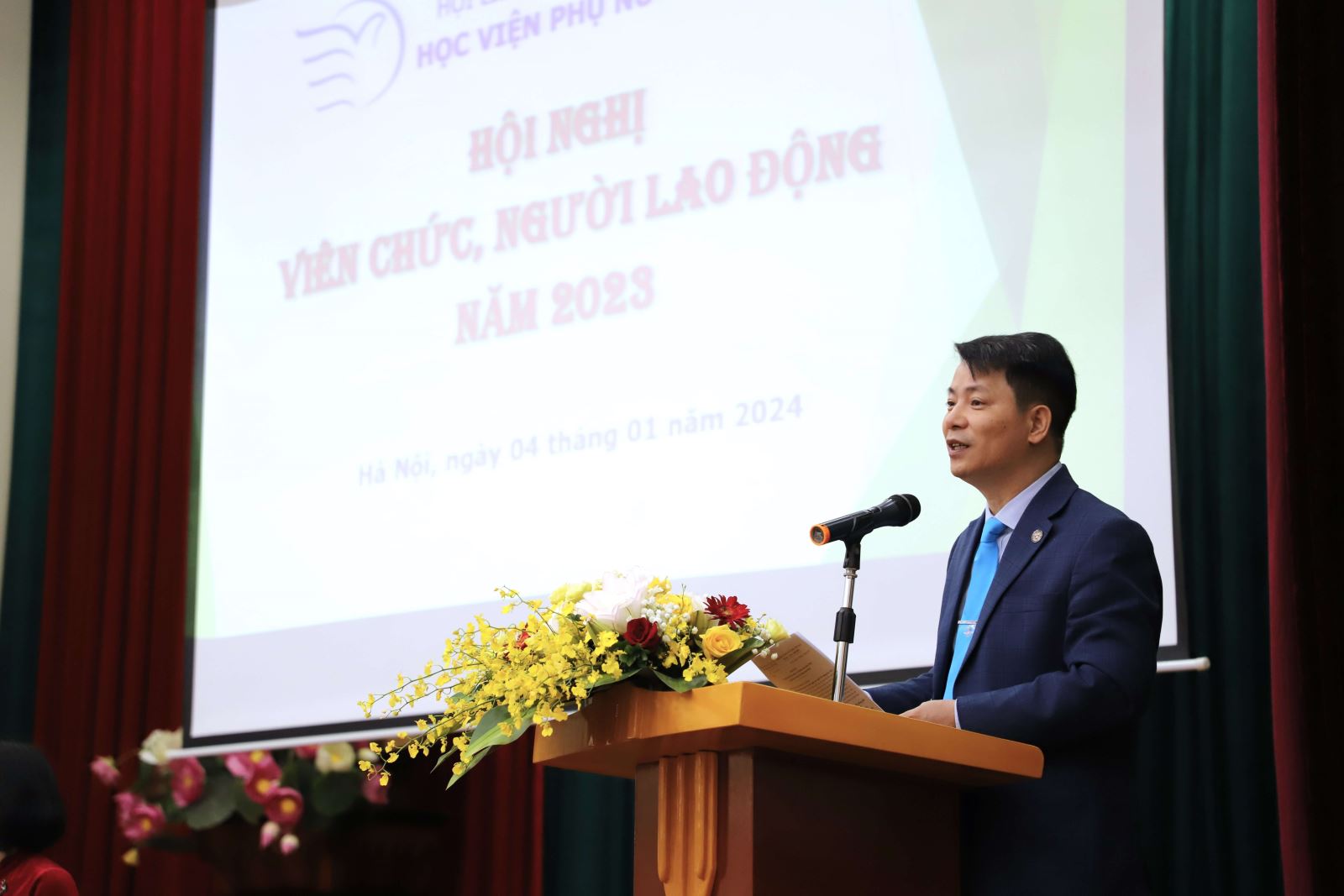 Hội nghị đã nghe đồng chí Hà Thị Thanh Vân – Phó Giám đốc Học viện trình bày báo cáo tổng kết công tác năm 2023, phương hướng, nhiệm vụ năm 2024 và điểm lại từng sự kiện ấn tượng thông qua clip hình ảnh; Đồng chí Hà Thúy Huyền – Trưởng phòng Tài chính kế toán báo cáo công khai tài chính; Đồng chí Đỗ Trọng Tuân – Trưởng Ban Thanh tra nhân dân báo cáo công tác thanh tra nhân dân năm 2023.