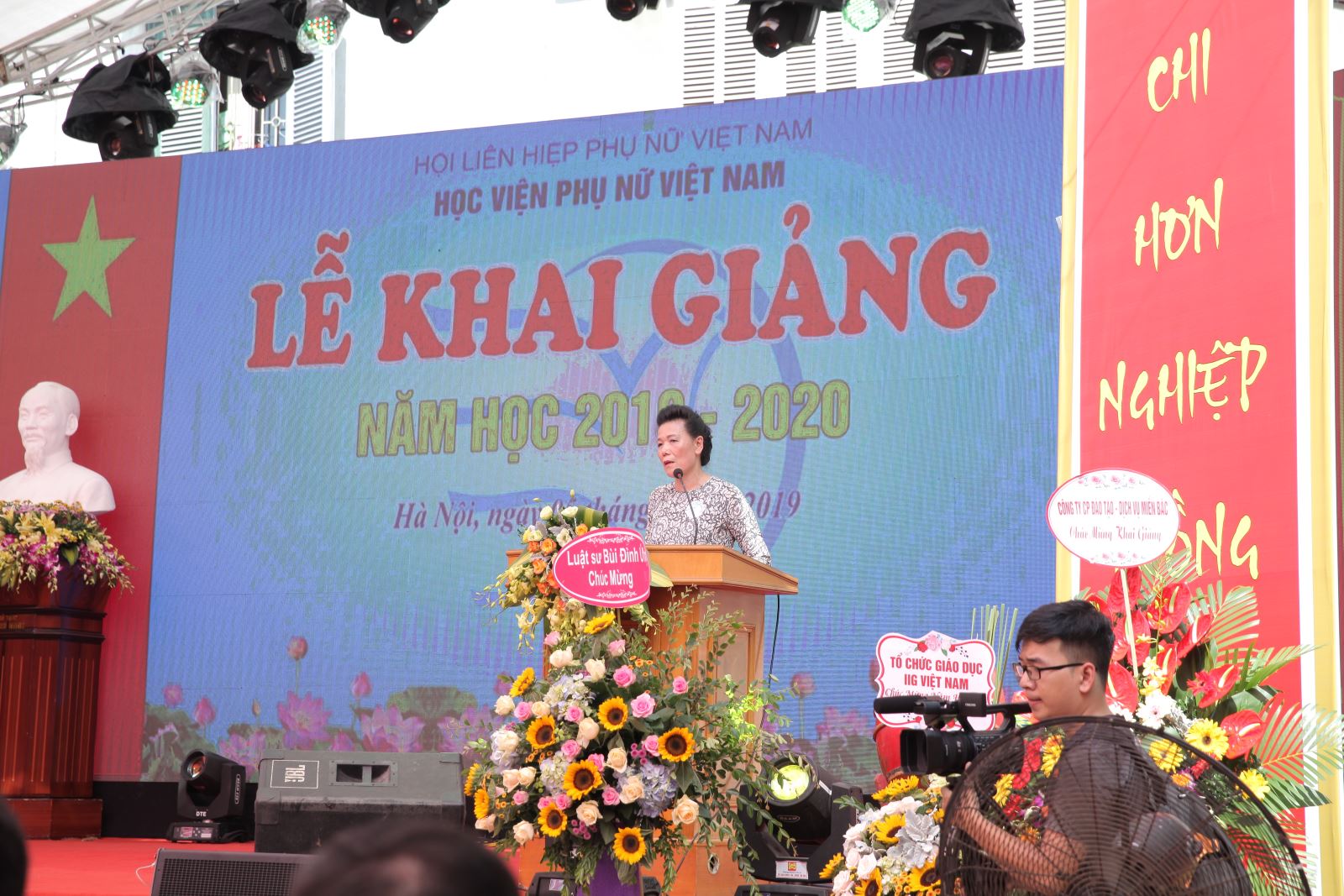 Gióng hồi trống khai trường và phát biểu chỉ đạo tại buổi lễ, Đồng chí Nguyễn Thị Tuyết, Phó Chủ tịch Hội Liên hiệp Phụ nữ Việt Nam thay mặt Đoàn Chủ tịch Hội Liên hiệp Phụ nữ Việt Nam đánh giá cao những nỗ lực và kết quả đã đạt được về đào tạo, bồi dưỡng, nghiên cứu khoa học và các nhiệm vụ khác của Học viện năm 2018 và năm học 2018 – 2019. Đồng chí chúc mừng Học viện đã tuyển sinh đạt chỉ tiêu đăng ký và chào mừng 700 sinh viên Khóa 7 nhập trường. Phó Chủ tịch bày tỏ sự tin tưởng và hy vọng, mỗi sinh viên đang theo học tại Học viện đều đã, đang và sẽ sẵn sàng tâm thế chủ động trong học tập, tự tin trao đổi, tự tìm tòi, học hỏi. Sinh viên Khóa 7 sẽ theo gương các anh, chị, các bạn khóa trước tìm hiểu kỹ và nhận thức đầy đủ về mối quan hệ giữa Học viện, thầy cô giáo và sinh viên; hiểu sâu sắc về quyết định của bản thân đối với ngành học đã lựa chọn để hành động đúng trong 4 năm ngồi trên ghế nhà trường theo hướng không chỉ học tốt và còn hoàn thiện các kỹ năng mềm để tiếp cận và làm tốt các công việc sau khi ra trường. Đặc biệt, Phó Chủ tịch Hội LHPNVN Nguyễn Thị Tuyết nhấn mạnh, Học viện cần chú trọng hơn trong việc hướng dẫn sinh viên lồng ghép giới trong ngành được đào tạo, hướng đến việc hỗ trợ để mỗi cử nhân tốt nghiệp từ Học viện sẽ là một chuyên gia về giới trong lĩnh vực công tác của mình.