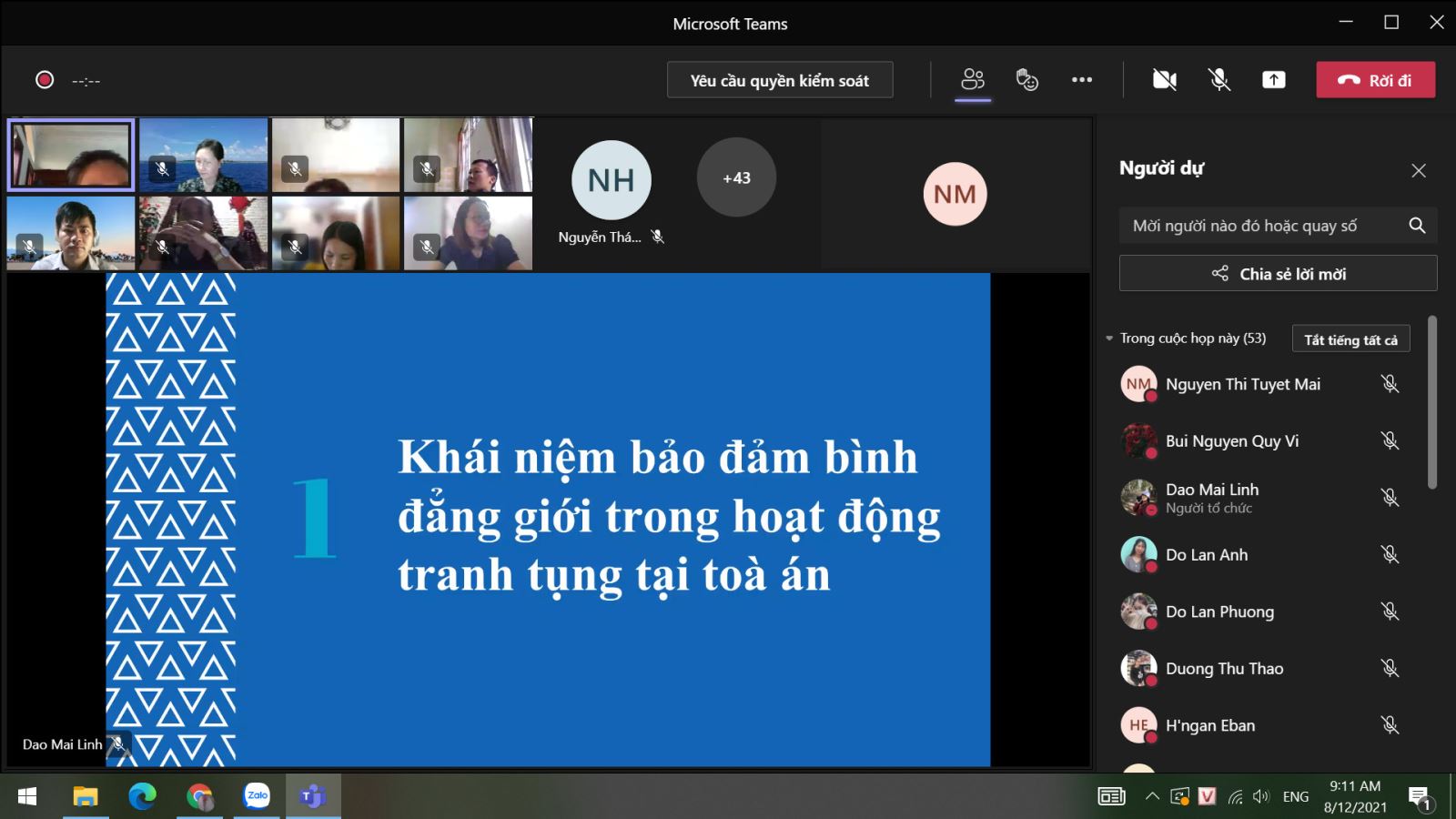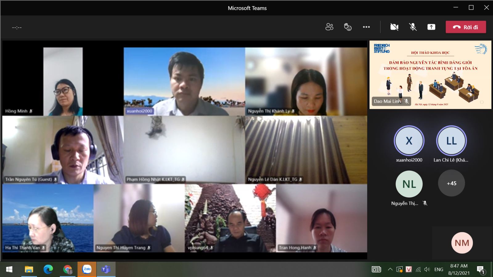 Hội thảo đã nghe 5/14 về tham luận: Pháp luật Việt Nam về bình đẳng giới trong hoạt động tranh tụng tại tòa án (PGS.TS. Nguyễn Thị Thu Hà, Giảng viên cao cấp, Phó trưởng Bộ môn Luật tố tụng dân sự, Đại học Luật Hà Nội); Bảo đảm nguyên tắc bình đẳng giới trong Luật tố tụng hình sự (TS. Lê Lan Chi, Phụ trách bộ môn Luật hình sự, Khoa Luật Đại học Quốc gia Hà Nội); Bảo đảm quyền bình đẳng của đương sự là phụ nữ trong tố tụng dân sự (ThS. Nguyễn Thị Huyền Trang Giảng viên khoa Luật, Học viện phụ nữ Việt Nam); Bình đẳng giới trong xét xử vụ án hôn nhân gia đình (Luật sư Nguyễn Anh Thơm, Văn phòng luật sư Nguyễn Anh, Đoàn Luật sư thành phố Hà Nội) và Bảo đảm bình đẳng giới trong hoạt động trợ giúp pháp lý (ông Trần Nguyên Tú, Vụ Pháp chế – Thanh tra, Tổng cục Giáo dục nghề nghiệp – Bộ Lao động – Thương binh và Xã hội).