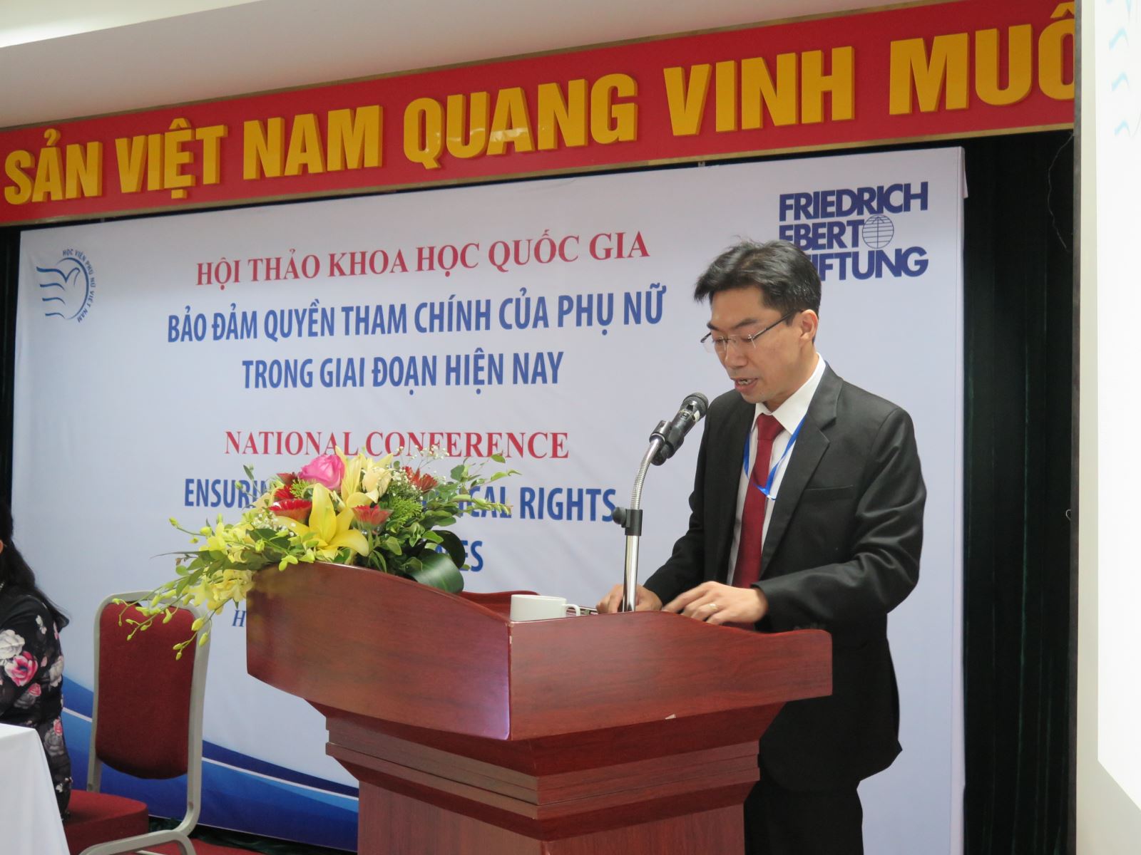 TS.Trần Quang Tiến, Bí thư Đảng ủy, Giám đốc Học viện phát biểu khai mạc đã khẳng định “Trong những năm qua, Học viện Phụ nữ Việt Nam đã tổ chức rất nhiều các hội thảo khoa học liên quan đến bình đẳng giới, phát triển kinh tế, kinh doanh, công tác phụ nữ cũng như các chủ đề khoa học xã hội khác nhưng đây là lần đầu tiên tổ chức hội thảo khoa học chuyên sâu về lĩnh vực luật pháp, về quyền của phụ nữ trong tham chính. Vì vậy tại hội thảo này, bên cạnh việc chia sẻ các kết quả nghiên cứu, các kinh nghiệm thực tiễn về chủ đề hội thảo, rất mong các nhà khoa học và quý vị đại biểu sẽ đóng góp ý kiến, gợi ý thêm những vấn đề khoa học và thực tiễn mà Học viện cần quan tâm tiếp theo”. Đồng thời, thể hiện sự cảm ơn Viện FES, các chuyên gia tư vấn, các nhà khoa học đã đã đồng hành, hỗ trợ và tích cực tham gia vào quá tình chuẩn bị và tổ chức hội thảo.