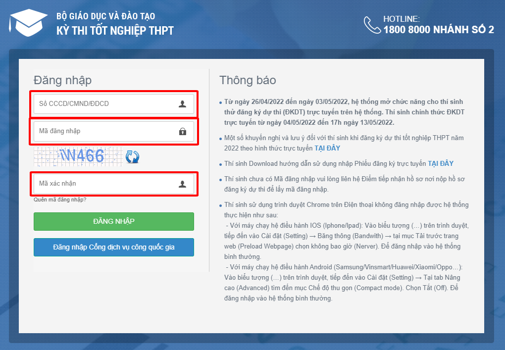BƯỚC 1: THÍ SINH TRUY CẬP VÀ ĐĂNG NHẬP VÀO HỆ THỐNG CỦA BỘ GIÁO DỤC VÀ ĐÀO TẠO: http://thisinh.thitotnghiepthpt.edu.vn/