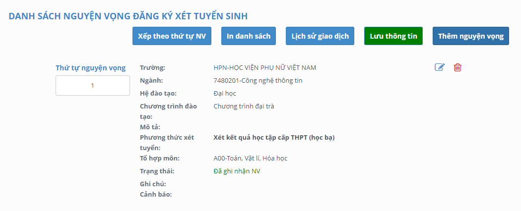 Sau khi nhấn “Chọn” tại phần Danh sách nguyện vọng đăng ký xét tuyển sinh sẽ hiển thị thông tin nguyên vọng thí sinh vừa đăng ký.