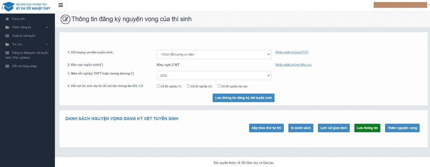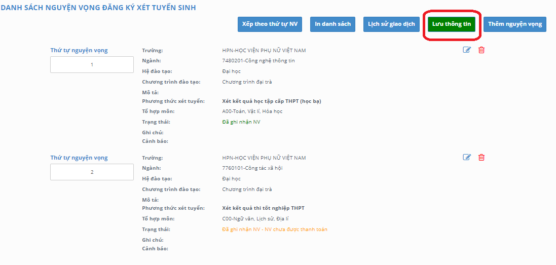 Sau khi thí sinh đã nhập đầy đủ nguyện vọng muốn đăng ký, thí sinh thực hiện “Lưu thông tin”.