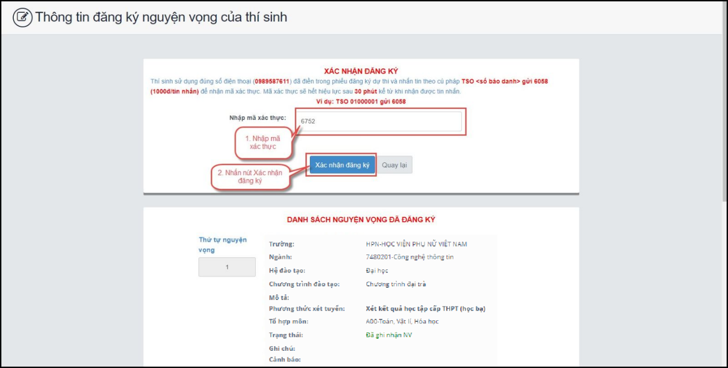 Khi nhận được mã xác thực trên điện thoại, thí sinh nhập mã vào ô “Nhập mã xác thực” và nhấn chọn “Xác nhận đăng ký”.