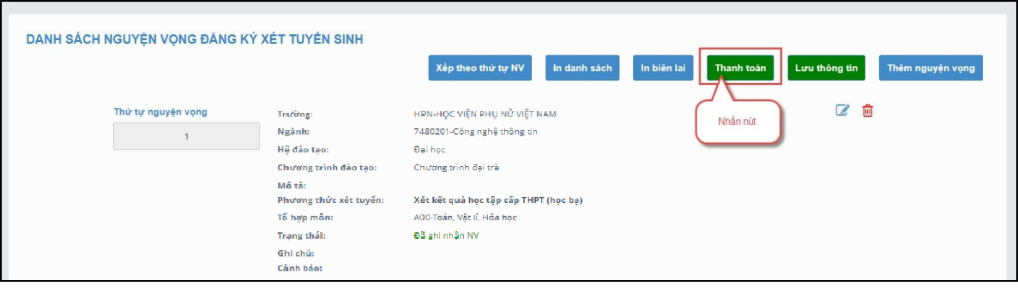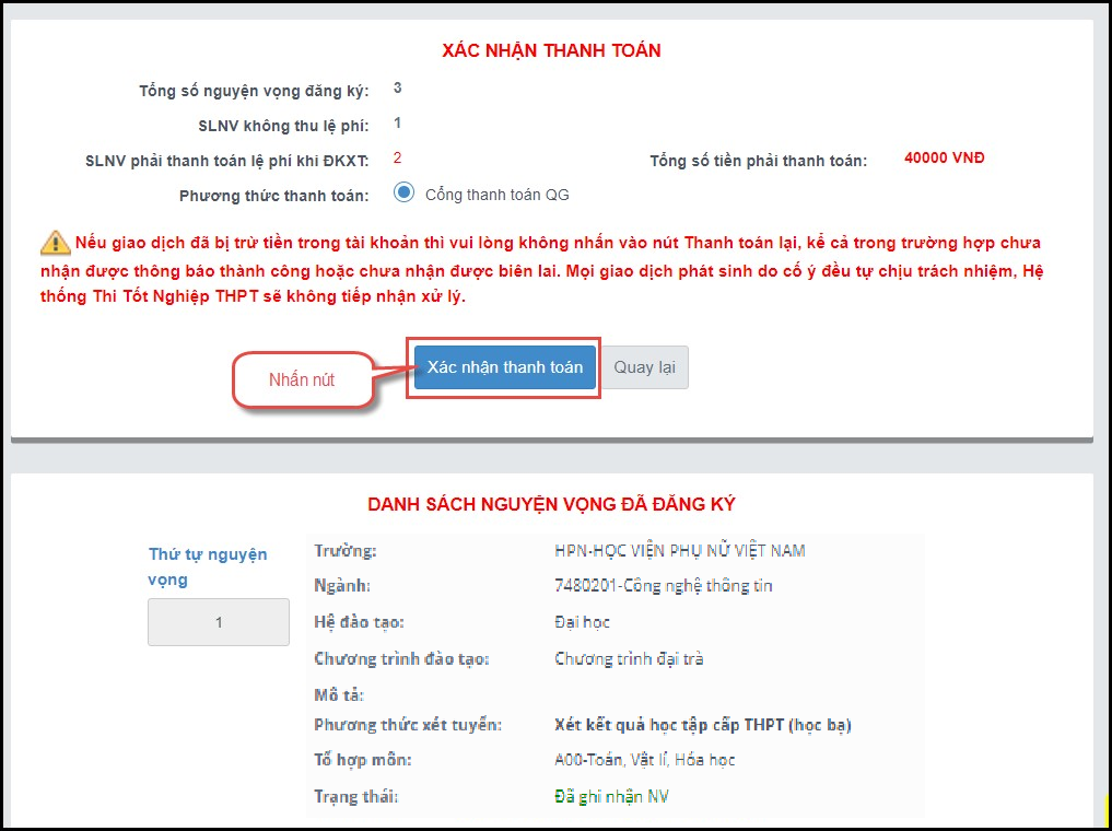 Để thực hiện thanh toán lệ phí, thí sinh nhấn nút ‘Thanh toán‘. Kiểm tra thông tin xác nhận thanh toán và nhấn nút ‘Xác nhận thanh toán‘ (thí sinh chỉ phải nộp lệ phí đối với các nguyện vọng có sử dụng xét tuyển bằng điểm thi tốt nghiệp THPT, 20.000 đồng/nguyện vọng).