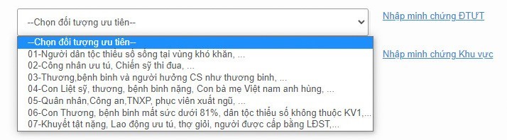 – Nếu thí sinh không thuộc đối tượng ưu tiên nào thì thí sinh chọn dòng đầu tiên “–Chọn đối tượng ưu tiên–‘.
