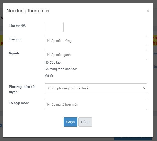 Sau khi nhấn chọn “Thêm nguyện vọng” màn hình sẽ hiển thị cửa sổ như sau: