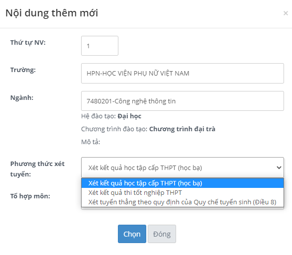 – Phương thức xét tuyển: Thí sinh chọn phương thức xét tuyển phù hợp (Ví dụ như hình bên dưới).