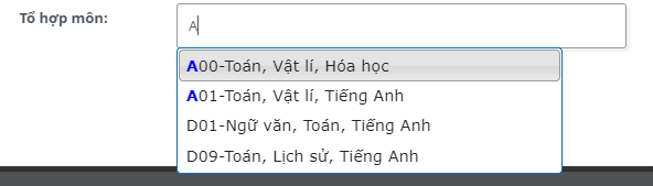 – Tổ hợp môn: Thí sinh nhập tổ hợp môn tương ứng với ngành và phương thức xét tuyển (Ví dụ: A00-Toán, Vật lí, Hóa học).