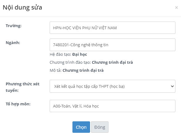 – Trường: Thí sinh nhập mã trường đăng ký nguyện vọng (Ví dụ: HPN-HỌC VIỆN PHỤ NỮ VIỆT NAM)