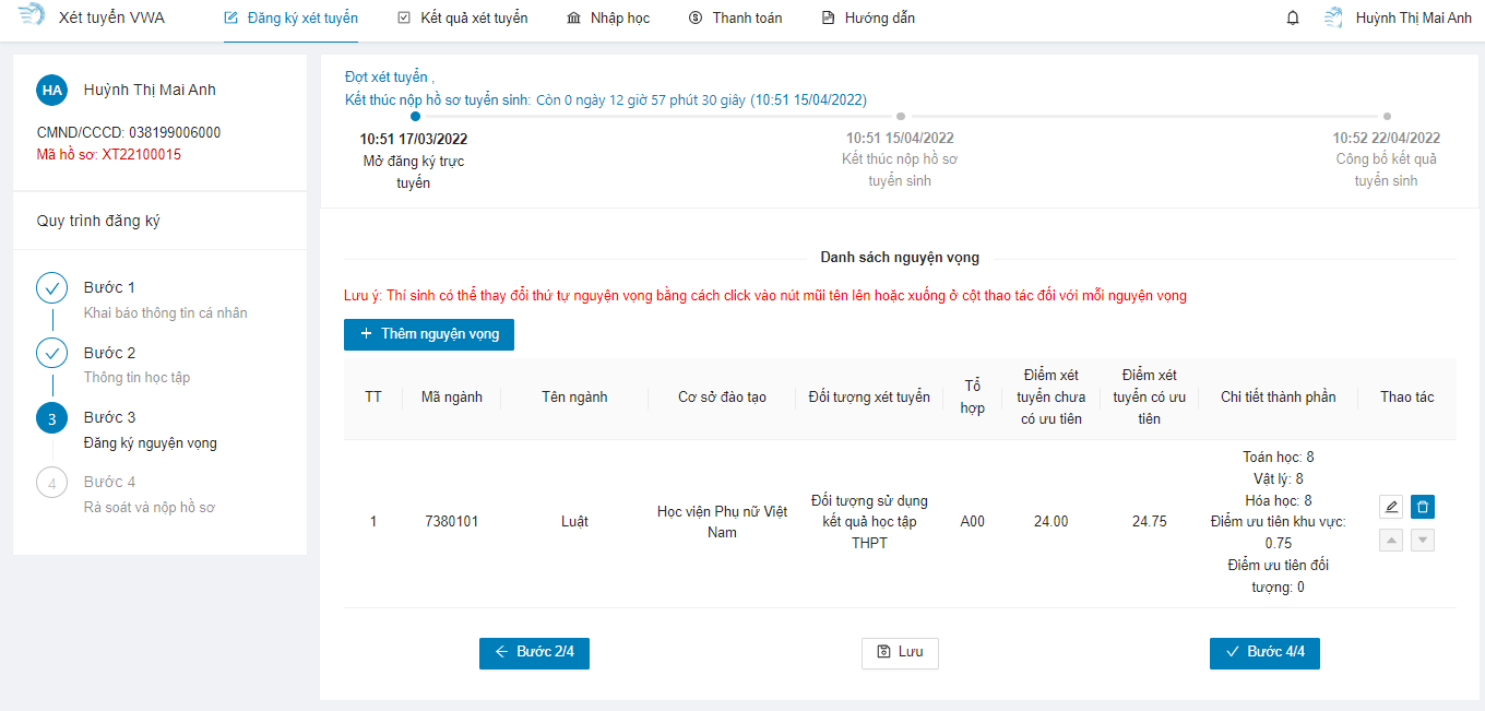 Bước 10: Tại cửa sổ này, thí sinh được lựa chọn nguyện vọng của mình. Thí sinh nhấn vào thêm nguyện vọng, sửa nguyện vọng. (Mỗi thí sinh được lựa chọn tối đa 2 nguyện vọng để tăng cơ hội xét tuyển vào Học viện). Thí sinh lưu ý qua mỗi cửa sổ Thí sinh nhấn Lưu để thông tin luôn được hệ thống lưu trữ.
