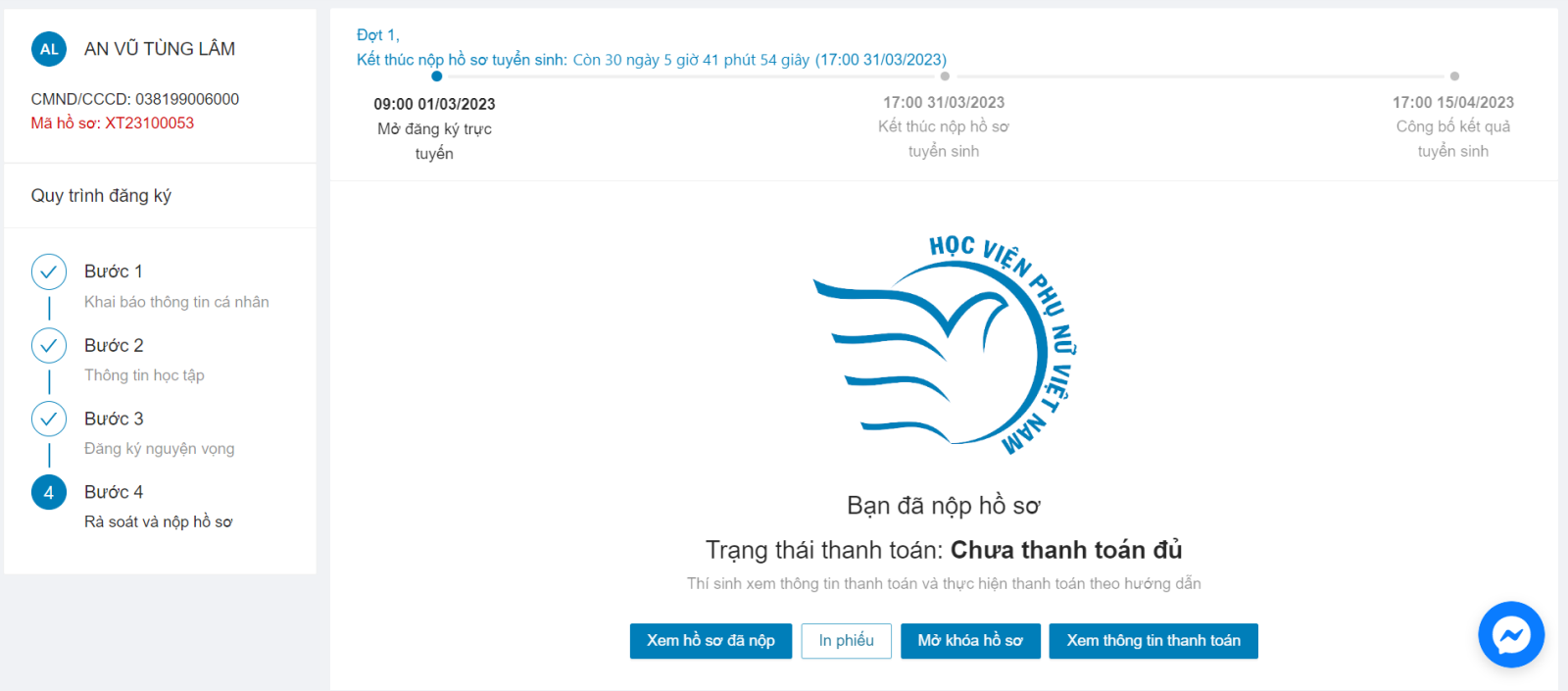 Bước 12: Sau khi Khoá Hồ sơ, sẽ có thông báo hiển thị trên màn hình và có email của Học viện gửi đến Thí sinh. Thí sinh lưu ý kiểm tra email của mình.
