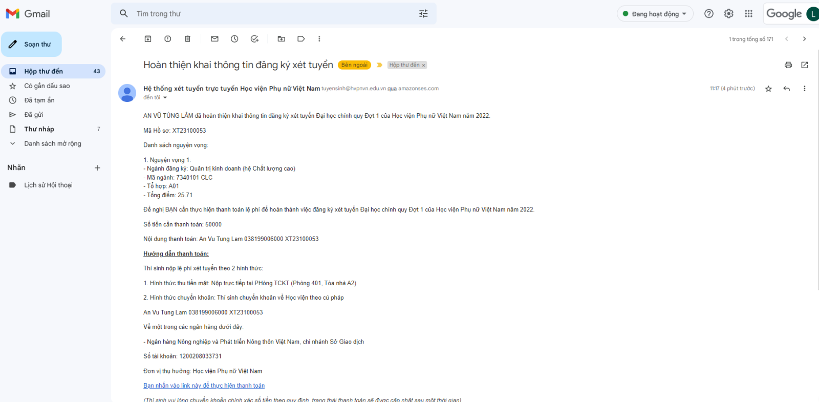 Bước 14: Học viện sẽ gửi email cho thí sinh sau khi thí sinh đã hoàn tất mọi thủ tục.
