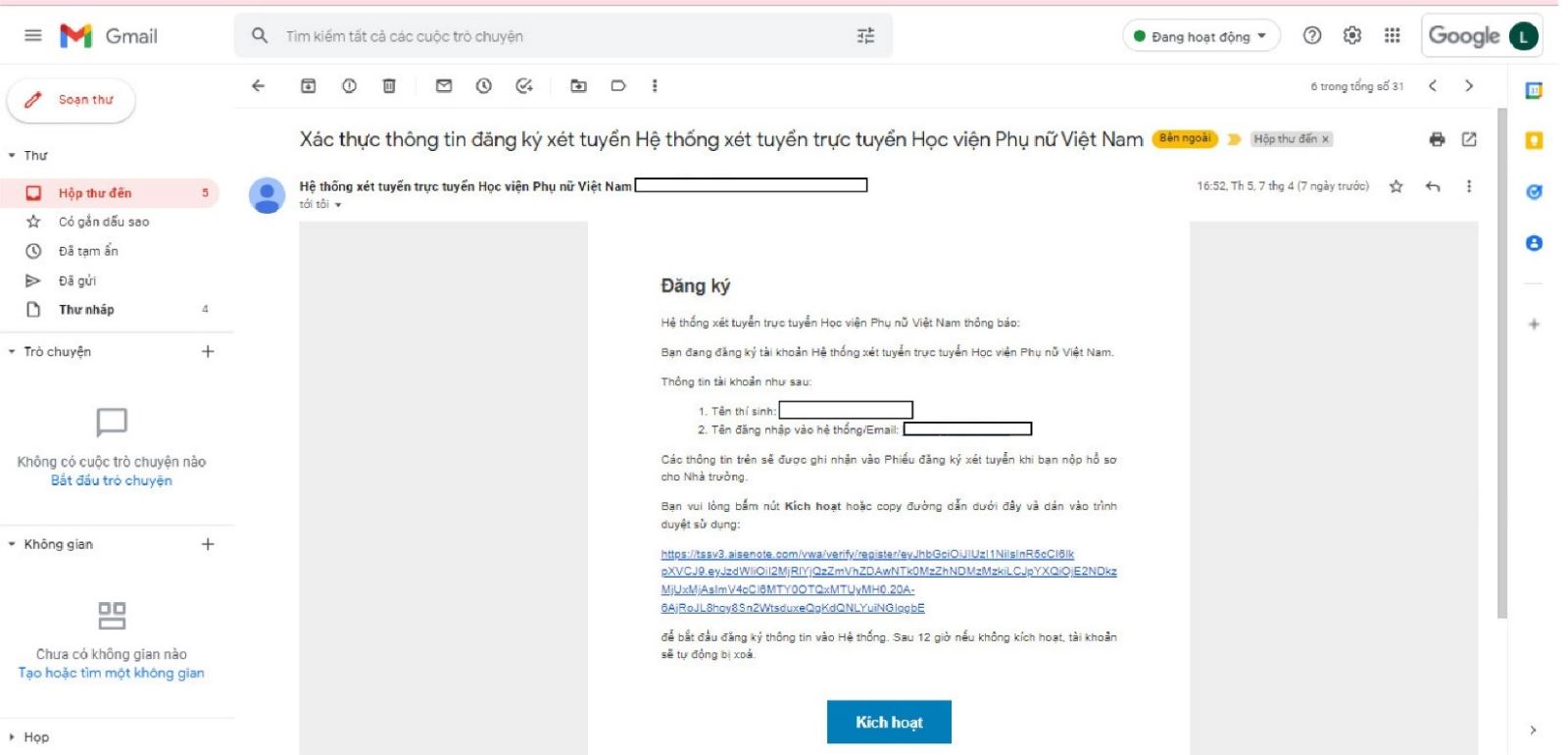 Bước 5: Sau khi đã Đăng ký tài khoản xong Thí sinh vào email mà mình đã đăng ký. Thí sinh nhấn vào Kích hoạt Tài khoản để tài khoản được xác nhận và đưa vào sử dụng.