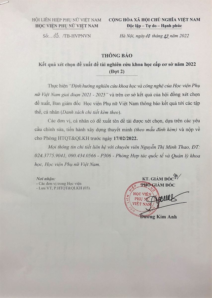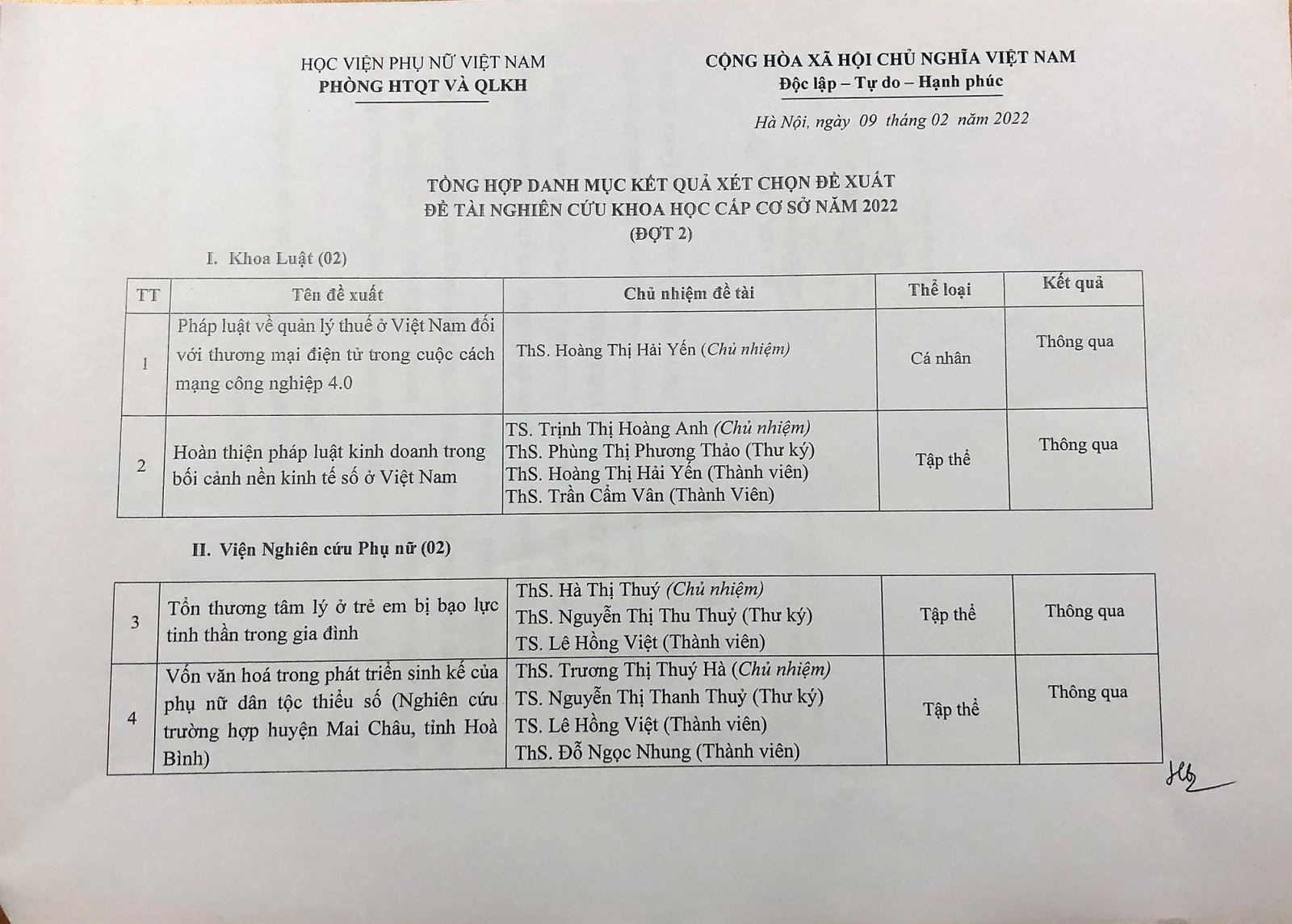 Tin tứcKết quả xét chọn đề tài NCKH cấp cơ sở (đợt 2) Posted on Tháng Ba 4, 2024 by admin(full) 04 Th3 admin(full) Quy tắc ứng xử của Học viện Phụ nữ Việt Nam Thông báo tuyển dụng nhân sự năm 2022