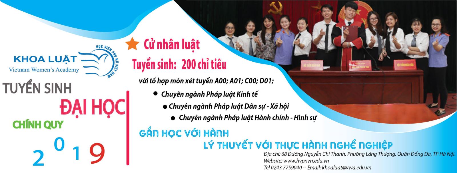 Năm học 2019-2020, Khoa Luật – Học viện Phụ nữ VN tuyển 200 chỉ tiêu CỬ NHÂN LUẬT các khối A, A1, C, D1 với hình thức xét tuyển theo học bạ (tổng 3 môn xét từ 18 điểm trở lên) và xét điểm thi THPT.