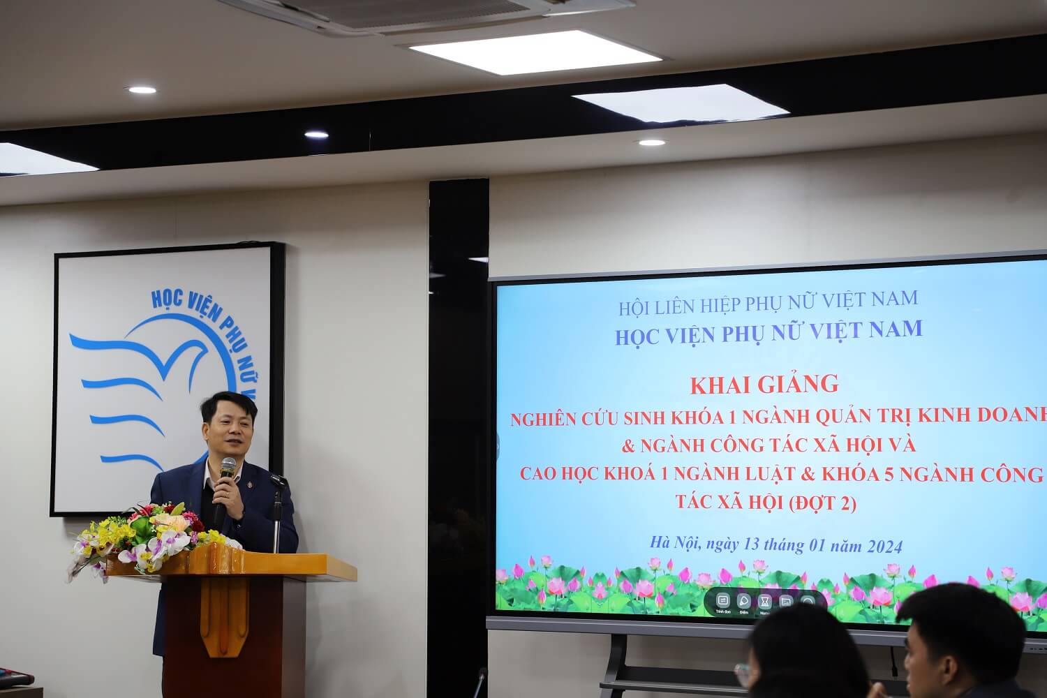 Trong buổi lễ khai giảng, thay mặt lãnh đạo Học viện Phụ nữ Việt Nam, PGS.TS. Trần Quang Tiến gửi lời chúc mừng đến các tân học viên nghiên cứu sinh, cao học ngành Công tác xã hội, Quản trị kinh doanh và Luật được đào tạo tại trụ sở Học viện ở Hà Nội và Phân hiệu tại thành phố Hồ Chí Minh. Giám đốc cảm ơn các học viên đã tin tưởng lựa chọn Học viện Phụ nữ Việt Nam là nơi để học tập, nghiên cứu trong những năm tháng tiếp theo của hành trình chinh phục tri thức.