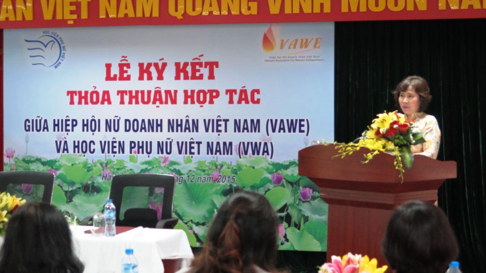 Phát biểu lại lễ ký kết, bà Hồ Thị Kim Thoa – Thứ trưởng Bộ Công thương – Chủ tịch Hội nữ doanh nhân Việt Nam bày tỏ sự vui mừng khi được đóng vai trò kết nối sự hợp tác giữa VWA và VAWE. Với những điểm tương đồng về tôn chỉ hoạt động, mục tiêu phấn đấu bà hi vọng hiệp hội nữ doanh nhân sẽ cùng Học viện Phụ nữ Việt Nam mở ra những cơ hội hợp tác nhằm hỗ trợ đào tạo nâng cao năng lực hội viên, kết nối hội viên vùng miền, góp phần phát triển cộng đồng doanh nghiệp và đội ngũ nữ doanh nhân Việt Nam phát triển kinh tế.
