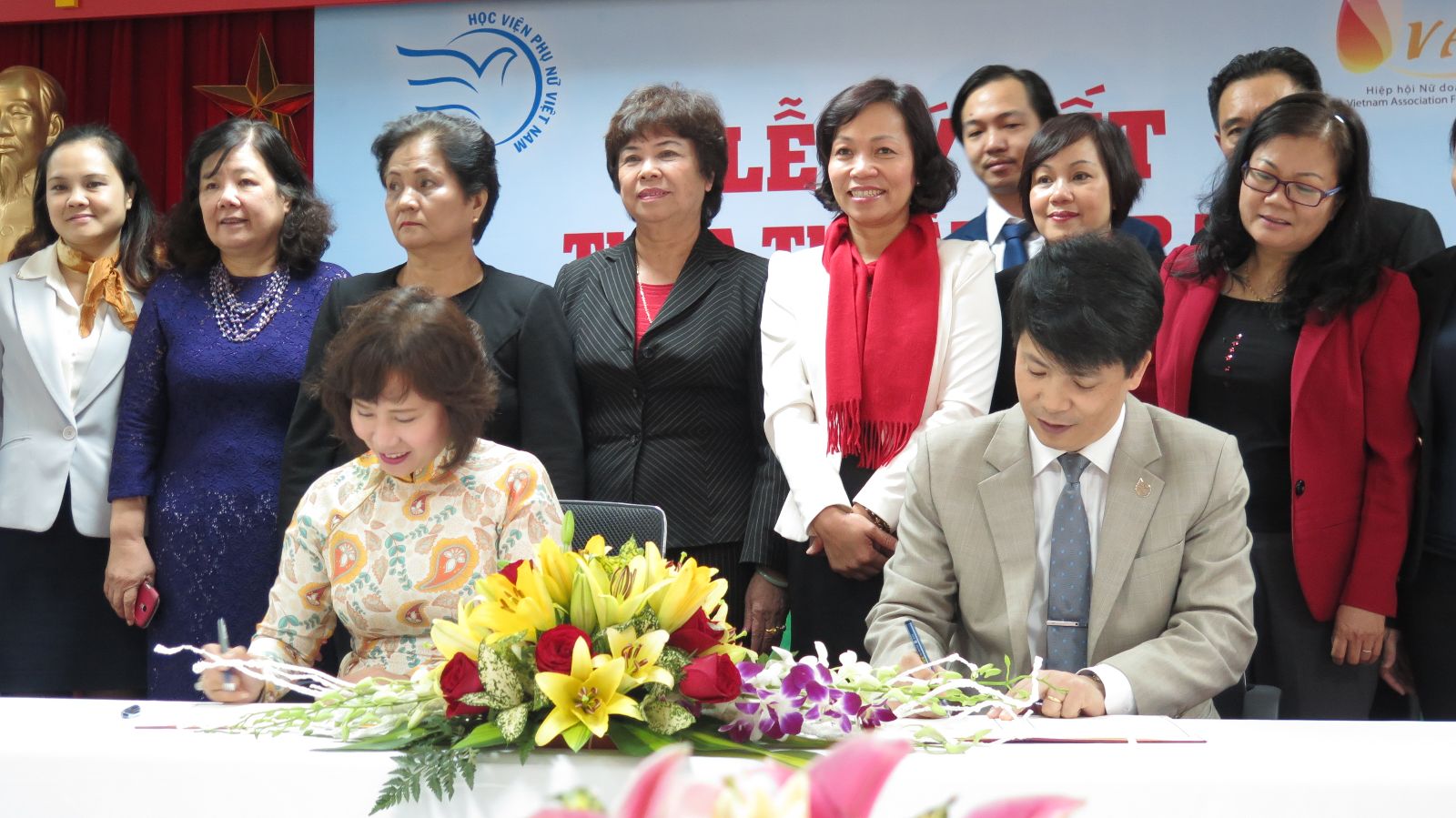 Sau phần phát biểu của đại diện hai bên, bà Hồ Thị Kim Thoa Thứ trưởng Bộ Công Thương, đại diện cho Hội nữ doanh nhân Việt Nam và Ts.Trần Quang Tiến đại diện cho Học viện Phụ nữ Việt Nam đã ký thỏa thuận hợp tác với sự chứng kiến của các vị đại biểu tham dự.