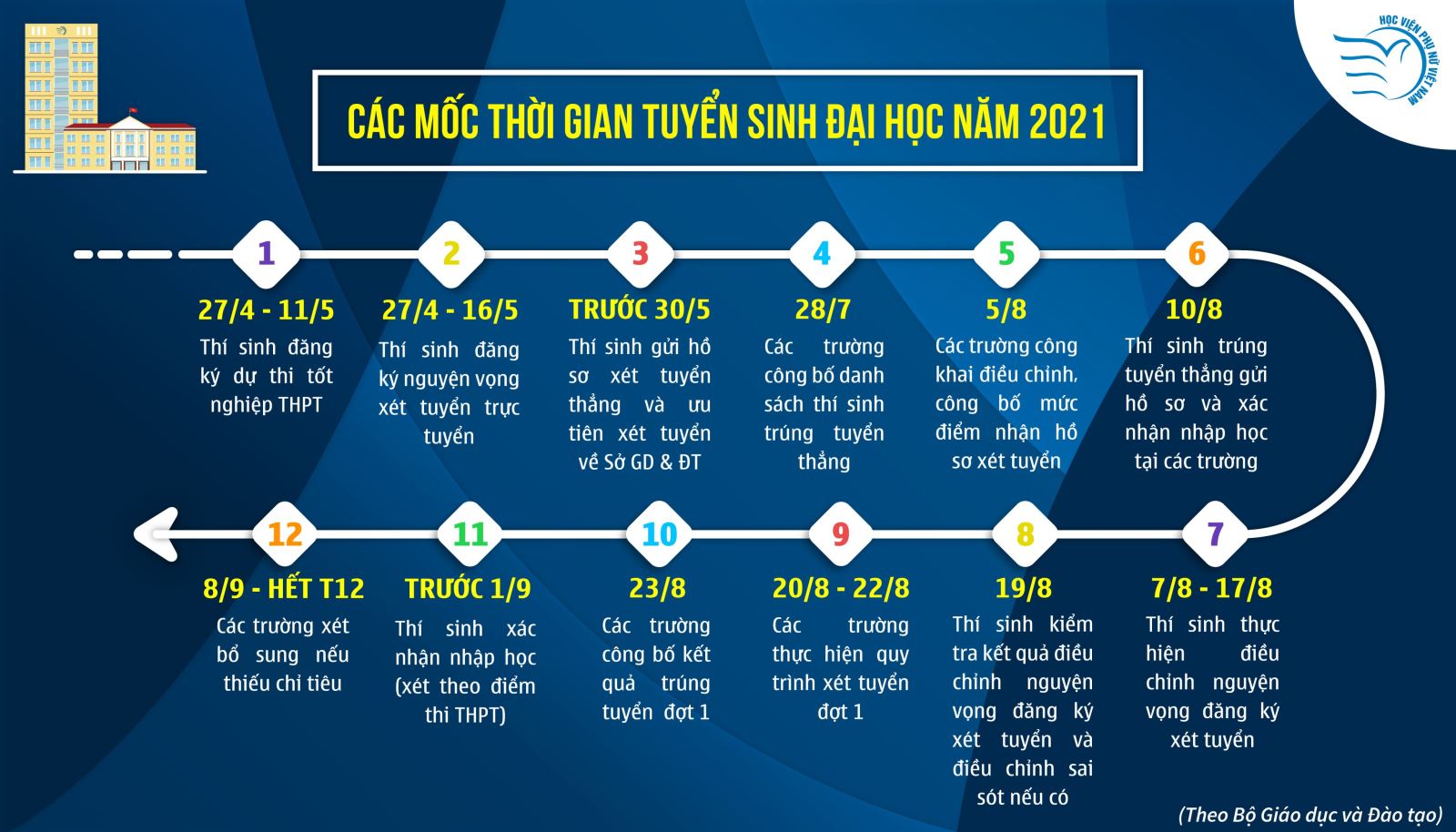 Năm 2021, Học viện tuyển sinh các khối ngành A00 (Toán, Lý, Hóa), A01 (Toán, Lý, Tiếng Anh), C00 (Văn, Sử, Địa), D01 (Toán, Văn, Tiếng Anh). Riêng ngành Truyền thông đa phương tiện, thí sinh có thể xét tuyển theo tổ hợp của khối V00 (Toán, Lý, Vẽ) và H1 (Toán, Văn, Vẽ).