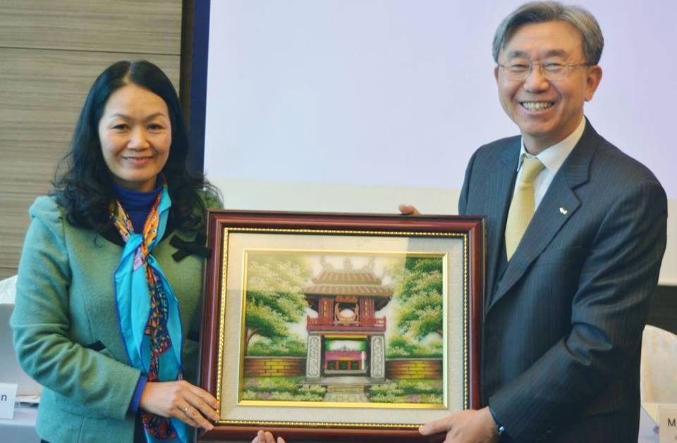 Bà Bùi Thị Hòa – Phó chủ tịch Hội LHPN Việt Nam tặng quà lưu niệm cho đại diện trường Đại học Chung Ang
