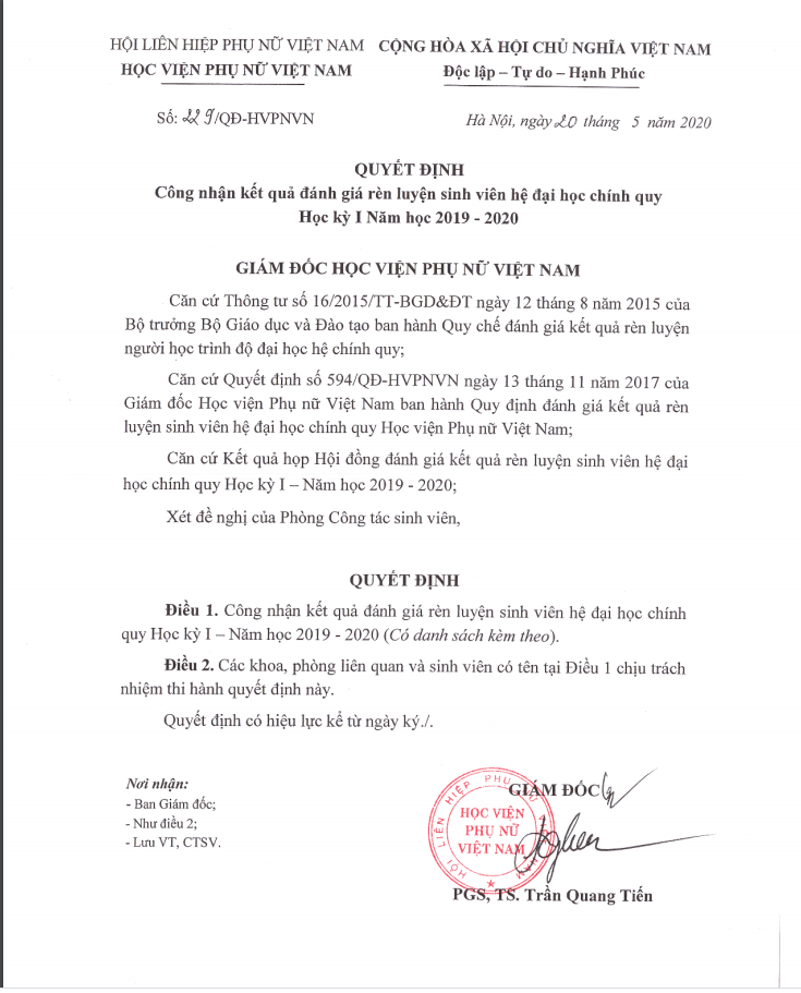 Tin tứcQuyết định công nhận đánh giá rèn luyện sinh viên HK1 năm học 2019 – 2020 Posted on Tháng Ba 4, 2024 by admin(full) 04 Th3 Mời bạn đọc xem chi tiết Danh sách kèm theo Quyết định TẠI ĐÂY admin(full) Sinh viên trở lại trường hoàn thành kỳ học kỳ 2 năm học 2019 – 2020 Cơ hội việc làm cho sinh viên Học viện Phụ nữ Việt Nam