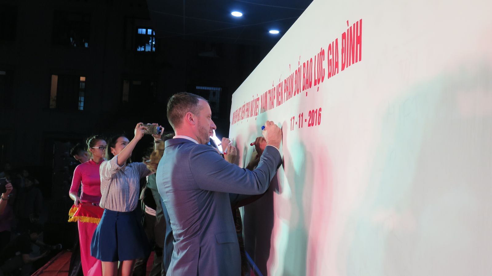 nam giới nói chung đều nhận thức sâu sắc trách nhiệm của mình trong việc lên tiếng phản đối bạo lực gia đình dưới bất kỳ hình thức nào đặc biệt là bạo lực đối với phụ nữ và trẻ em. Ông tin tưởng và lạc quan vào thế hệ trẻ hôm nay, đặc biệt là sinh viên Học viện Phụ nữ Việt Nam lên tiếng ủng hộ cho sự nhận thức về bạo lực đối với phụ nữ và trẻ em gái. Ông cho biết, Chính phủ Australia luôn đặt vấn đề bình đẳng giới và trao quyền cho phụ nữ là một trong những ưu tiên hàng đầu nhằm góp phần đẩy lùi BLGĐ bằng nhiều hình thức khác nhau. Bằng việc thắp sáng một ngọn nến, mỗi cá nhân tham gia sự kiện có thể bày tỏ sự tôn trọng đối với tất cả phụ nữ, trẻ em đã chịu ảnh hưởng của BLGĐ trong cuộc sống.