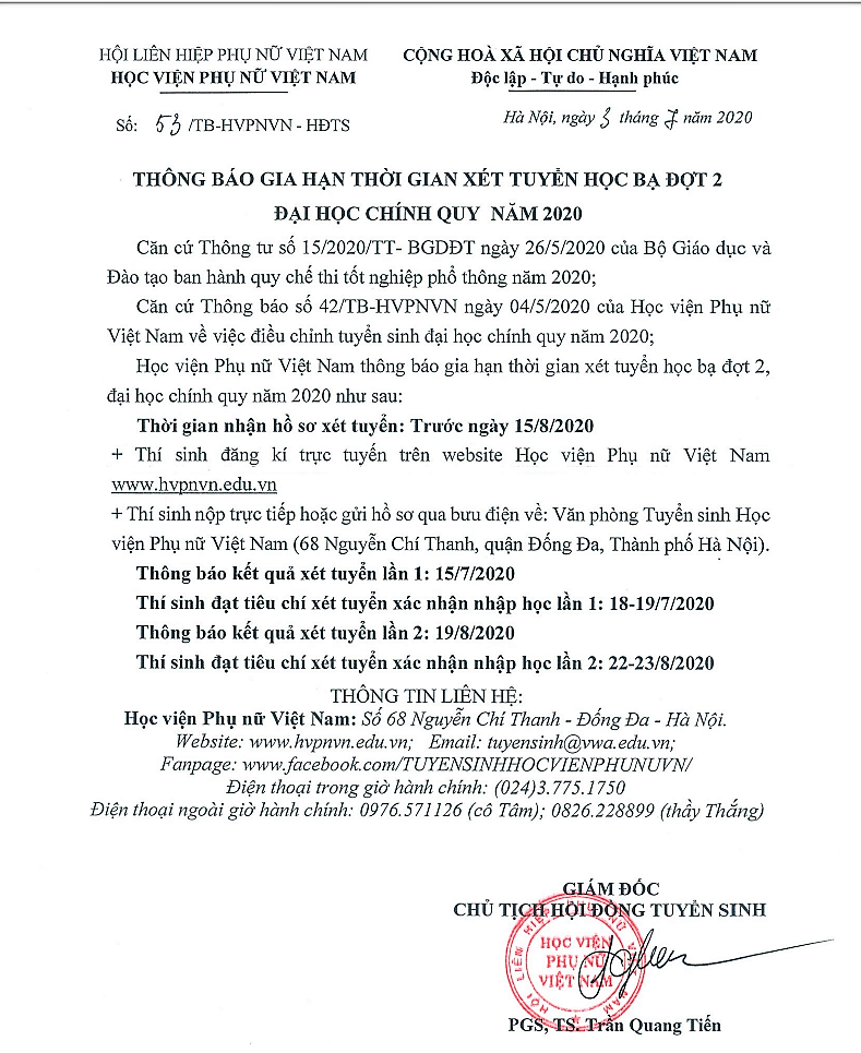 Tin tứcTHÔNG BÁO GIA HẠN THỜI GIAN XÉT HỌC BẠ ĐỢT 2 Posted on Tháng Ba 4, 2024 by admin(full) 04 Th3 LINK ĐĂNG KÝ XÉT TUYỂN TRỰC TUYẾN PHIẾU ĐĂNG KÝ XÉT TUYỂN PHIẾU ĐĂNG KÝ XÉT TUYỂN THẲNG admin(full) Sinh viên trở lại trường hoàn thành kỳ học kỳ 2 năm học 2019 – 2020 Cơ hội việc làm cho sinh viên Học viện Phụ nữ Việt Nam