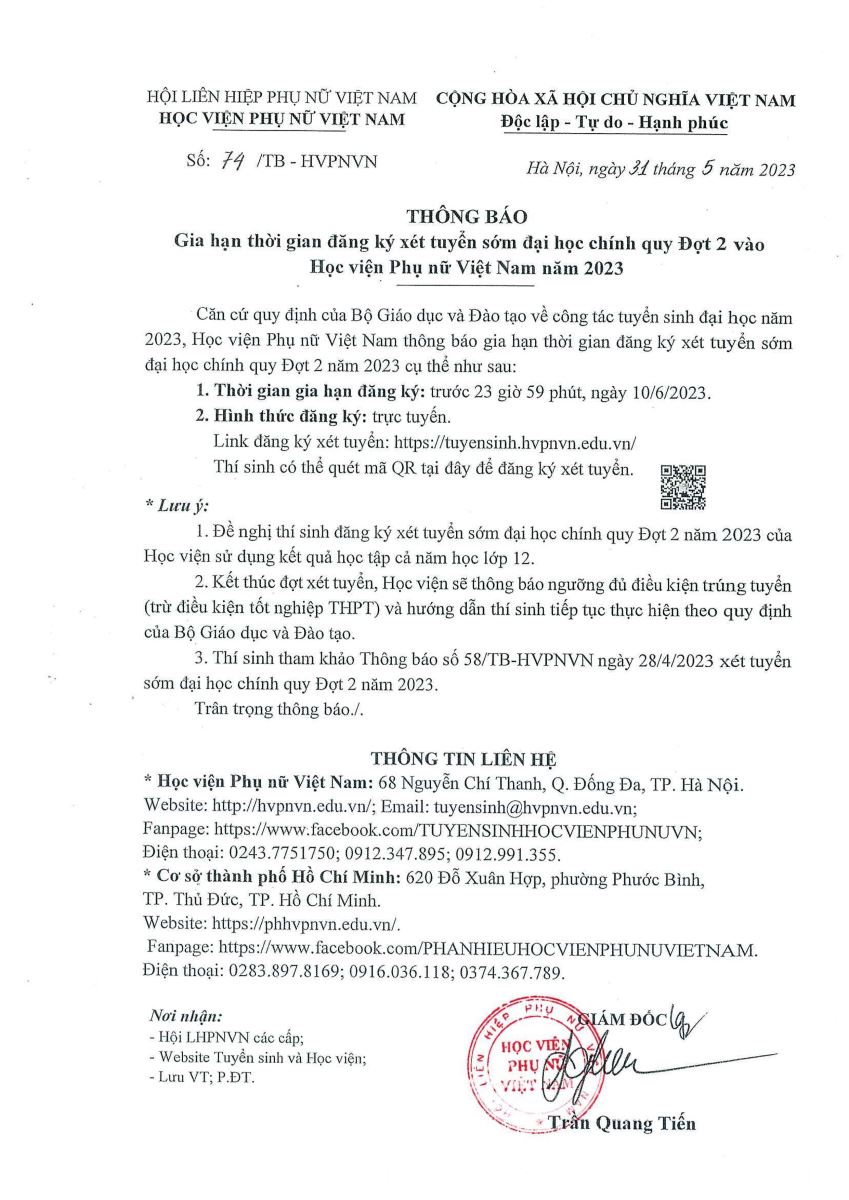 Xem thông báo số 58/TB-HVPNVN về việc xét tuyển sớm đợt 2 TẠI ĐÂY
