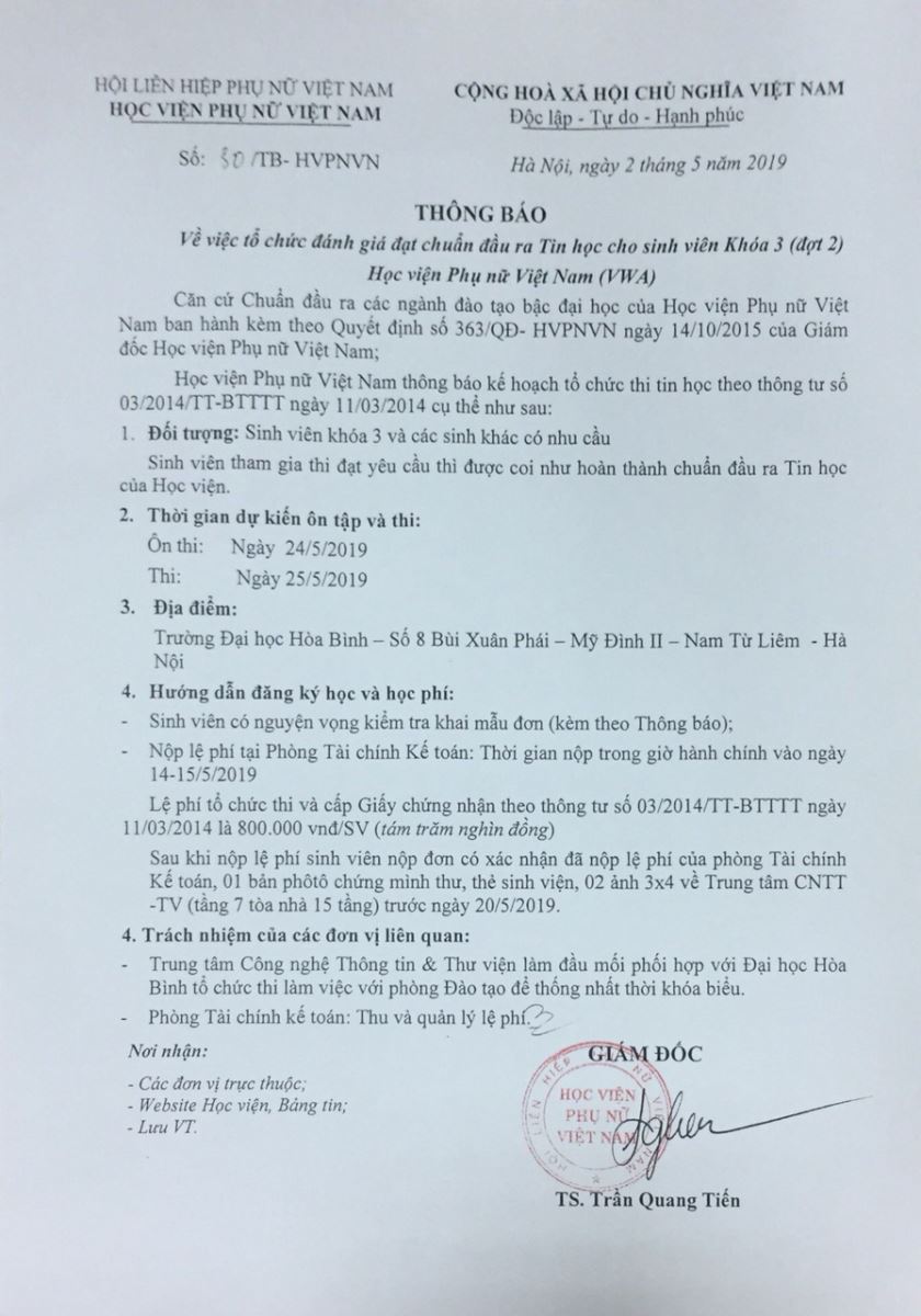 Thông báo kế hoạch thi chuẩn đầu ra Tin học dành cho K3