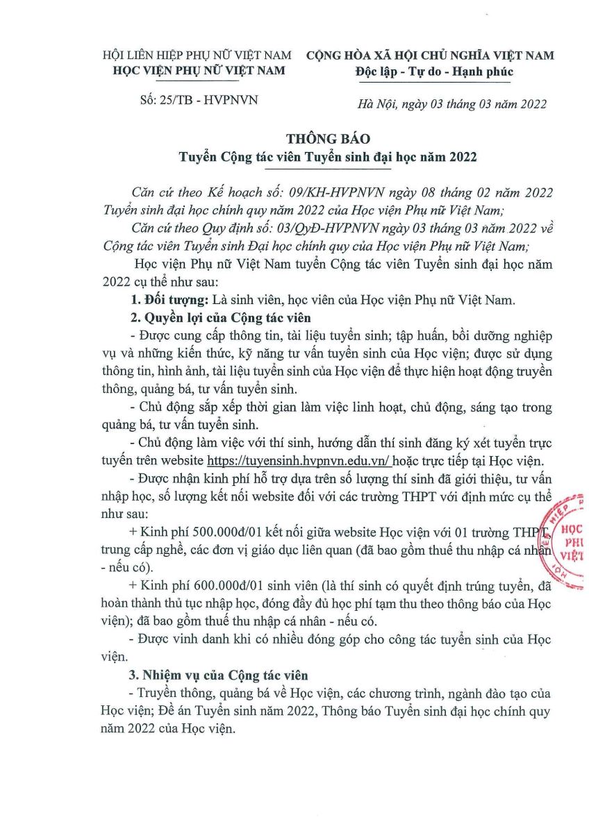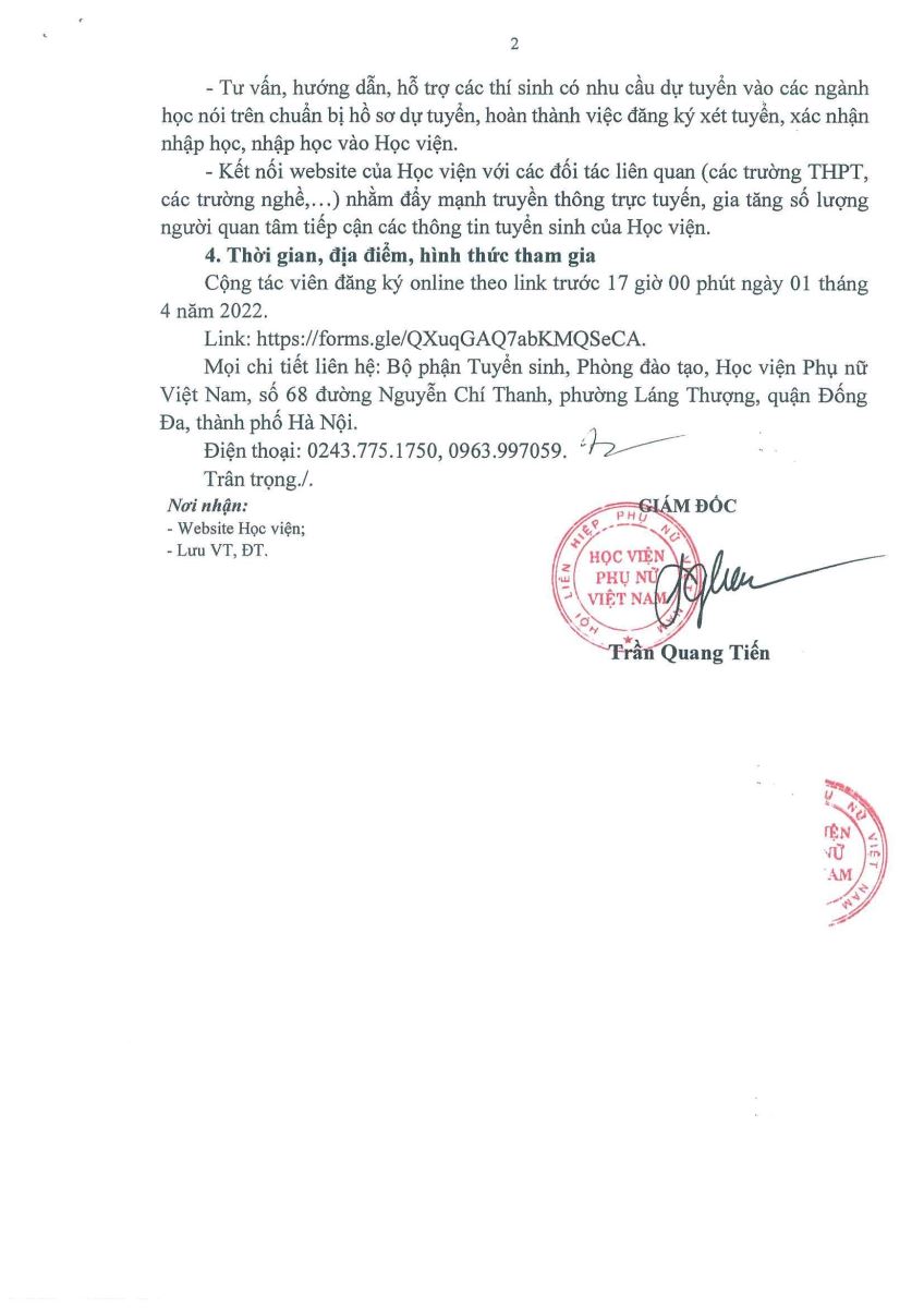 Tin tứcThông báo tuyển cộng tác viên tuyển sinh năm 2022 Posted on Tháng Ba 4, 2024 by admin(full) 04 Th3 ĐĂNG KÝ TRỞ THÀNH CỘNG TÁC VIÊN TUYỂN SINH TẠI ĐÂY admin(full) Quy tắc ứng xử của Học viện Phụ nữ Việt Nam Thông báo tuyển dụng nhân sự năm 2022