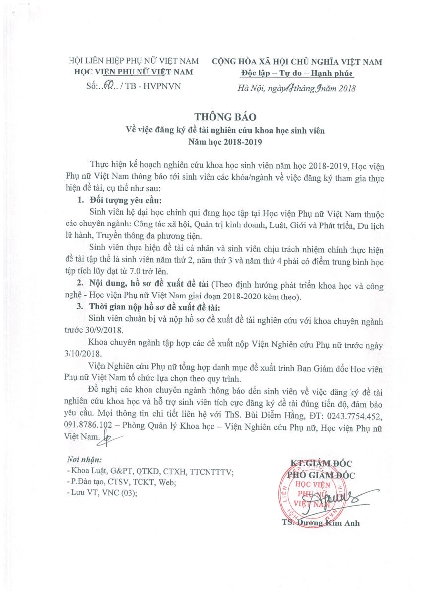 Thông báo về việc đăng ký đề tài NCKH sinh viên năm 2018 – 2019