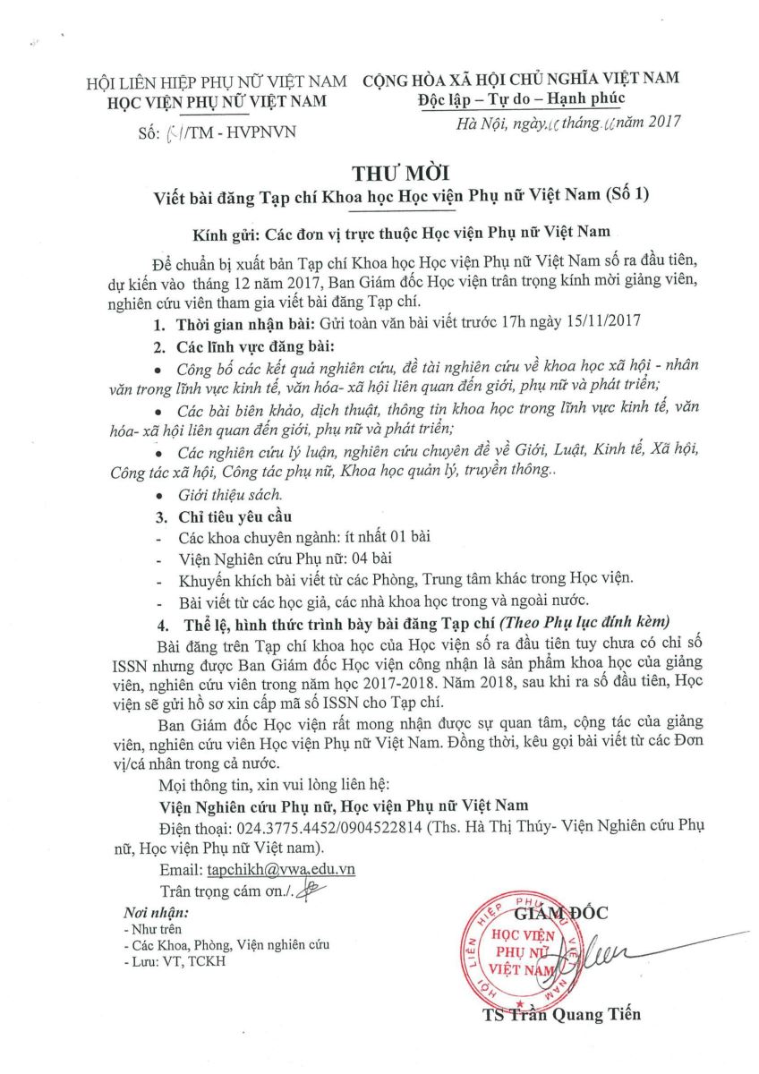 Thư mời viết bài đăng Tạp chí khoa học số 1 – Học viện Phụ nữ Việt Nam