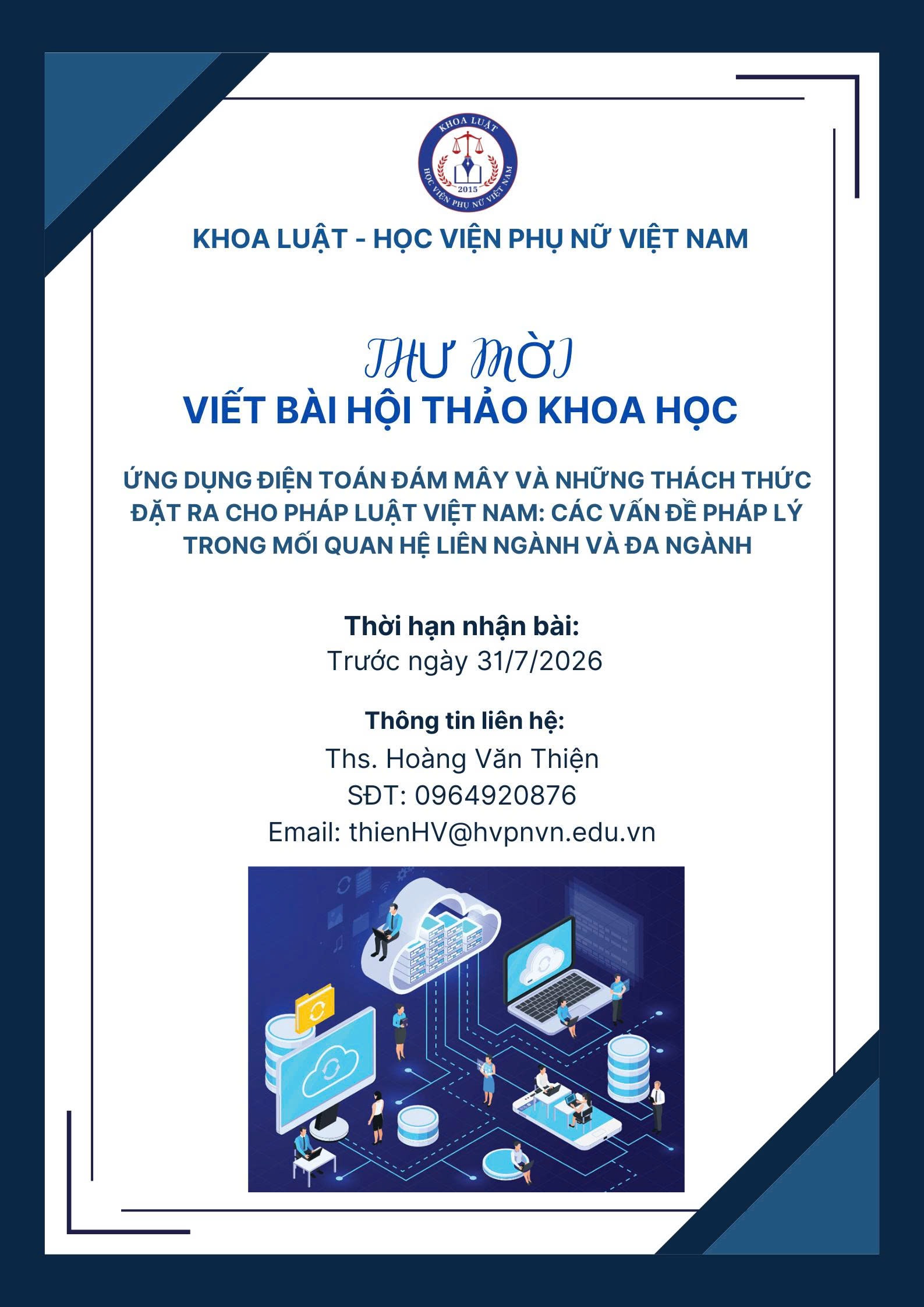 Thực hiện Kế hoạch chuyên môn số 130/KH-HVPNVN ngày 24/3/2026 về việc tổ chức Hội thảo Khoa học giảng viên năm 2026, nhằm tăng cường trao đổi học thuật, chia sẻ kinh nghiệm nghiên cứu khoa học, Khoa Luật – Học viện Phụ nữ Việt Nam trân trọng thông báo và kính mời các nhà khoa học, chuyên gia nghiên cứu, giảng viên, nghiên cứu viên tham gia viết bài cho Hội thảo với chủ đề “Ứng dụng điện toán đám mây và những thách thức đặt ra cho pháp luật Việt Nam: Các vấn đề pháp lý trong mối quan hệ liên ngành và đa ngành”.