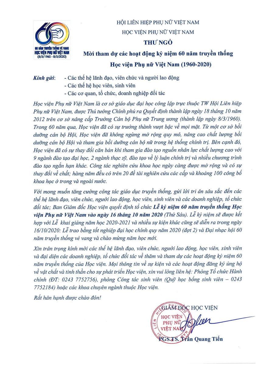 Tin tứcThư ngỏ mời tham dự kỷ niệm 60 năm truyền thống Học viện Phụ nữ Việt Nam Posted on Tháng Ba 4, 2024 by admin(full) 04 Th3 admin(full) Phát biểu khai mạc Lễ Công bố quyết định và trao chứng nhận kiểm định chất lượng cơ sở giáo dục Quyết định cấp học bổng HK 2 năm học 2019 – 2020